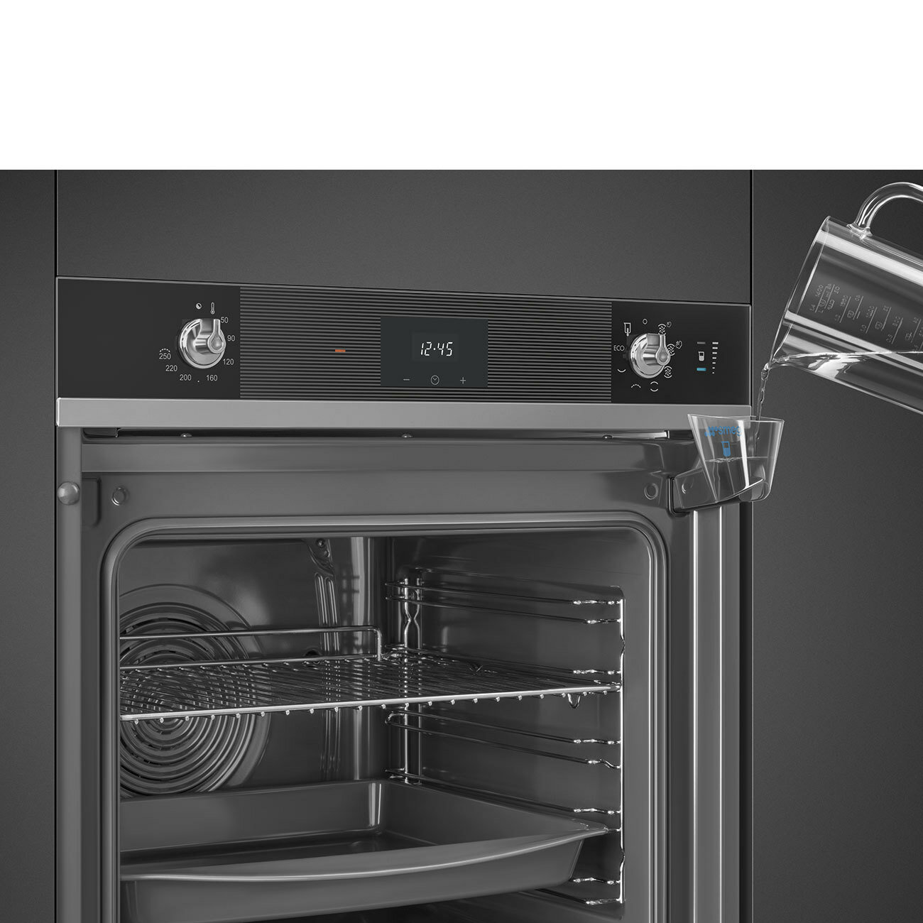 быстрый нагрев, добавление пара, таймер, Вентилятор охлаждения, Встроенные часы, Двухуровневое приготовление, Защитное покрытие от отпечатков пальцев, Хромированные направляющие