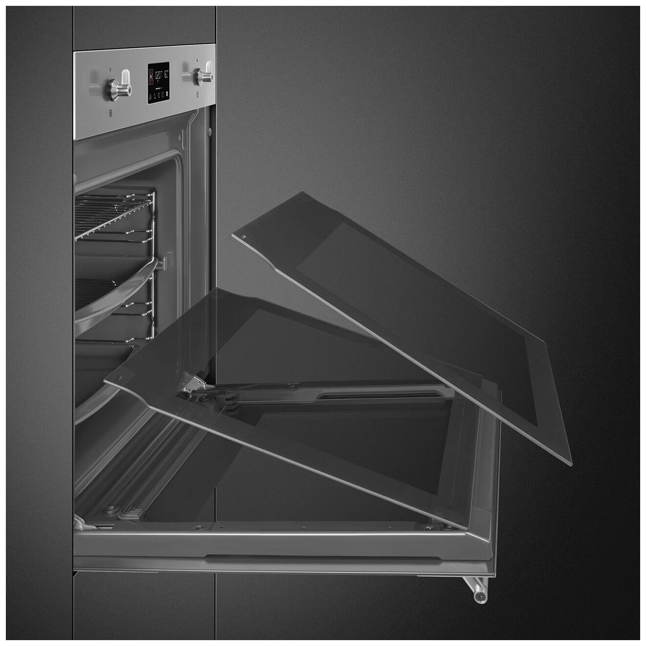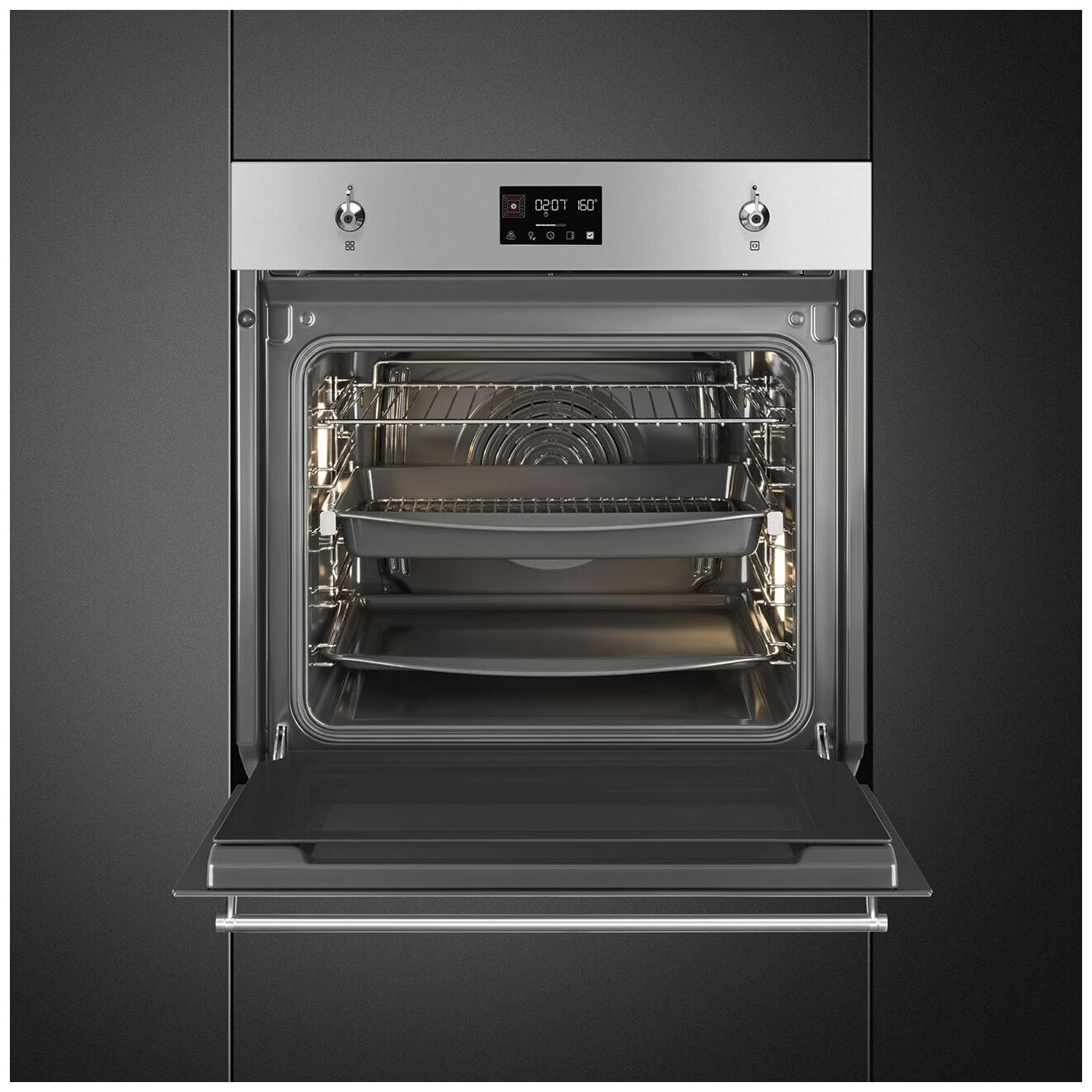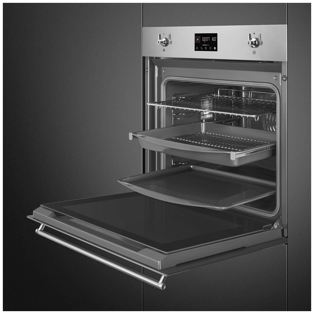 электронный программатор, индикация времени приготовления, доводчик дверцы духовки, телескопические направляющие - в комплекте; аварийное отключение духовки; сетевой кабель без вилки; размер ниши: высота - 585 мм, ширина - 564 мм, глубина - 560мм; глубокий противень - 1; эмаль Ever Clean