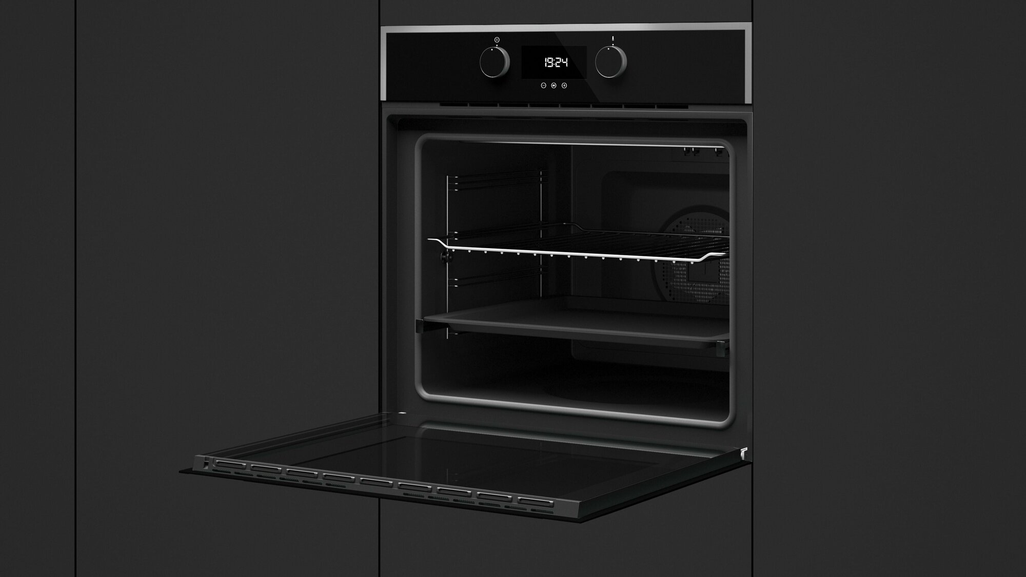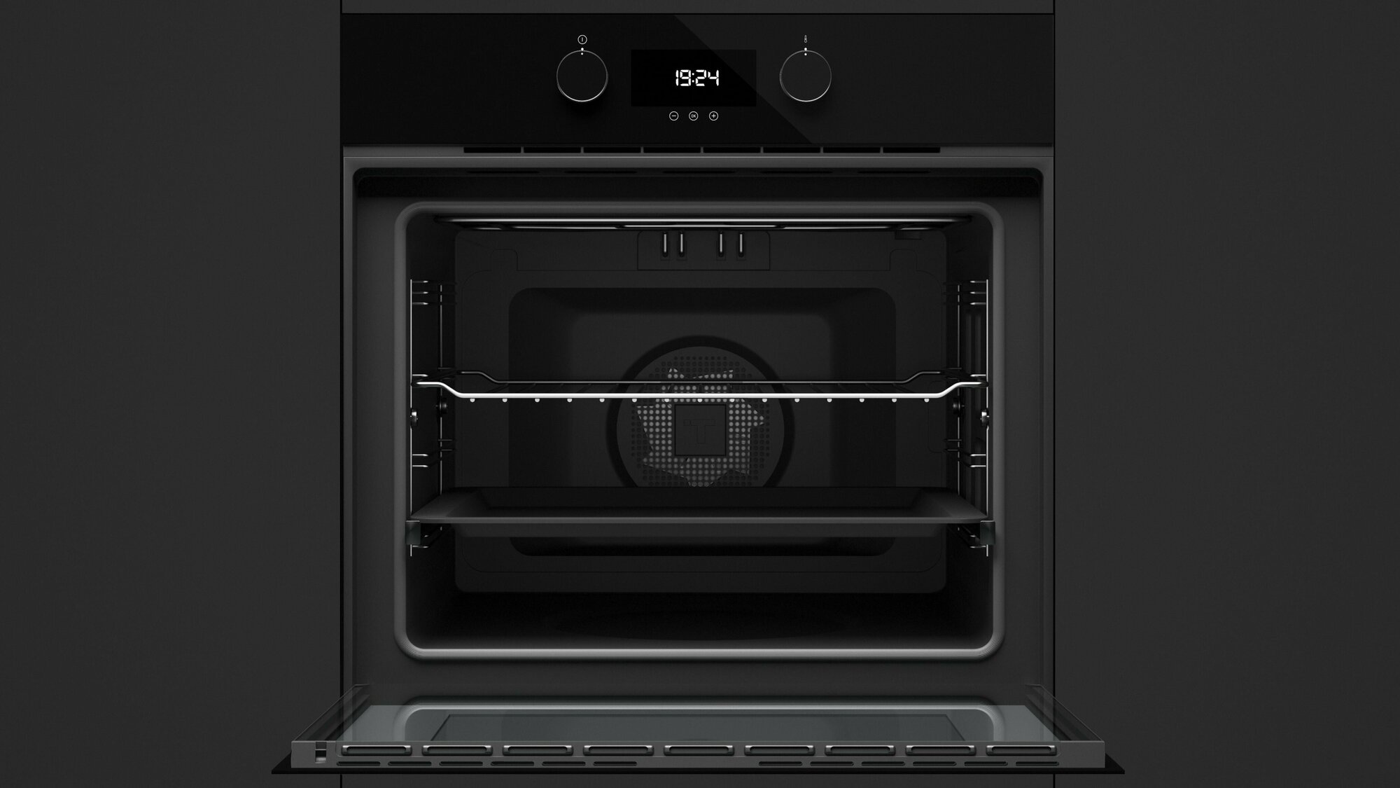 Духовой шкаф вместительный, его объём составляет 70 литров. В рабочей камере предусмотрено целых пять уровней, на которых можно готовить блюда одновременно. Так как горячий воздух благодаря вентиляторам активно циркулирует по внутреннему пространству, термическая обработка равномерная и качественная.