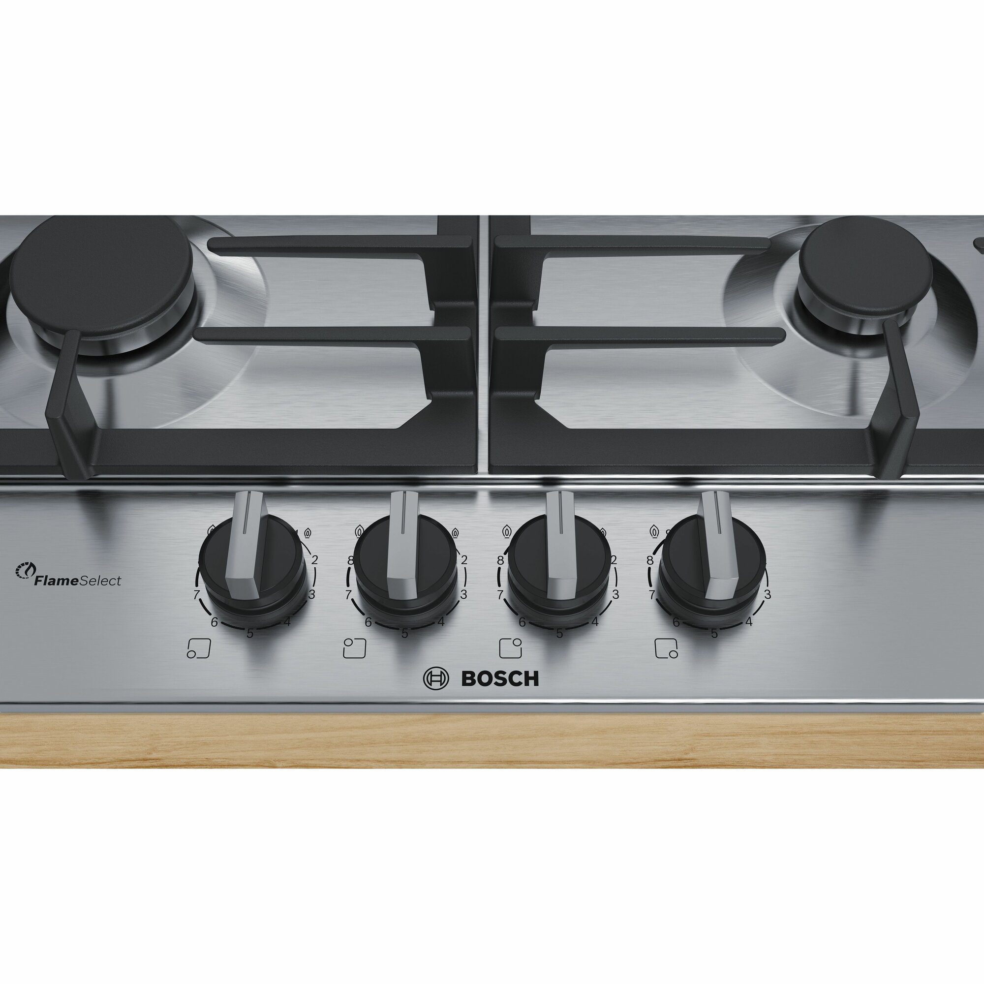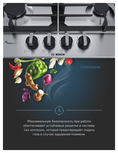Варочная панель из нержавеющей стали Bosch PCP 6A5B90R оснащена 9-ступенчатым регулятором пламени FlameSelec.