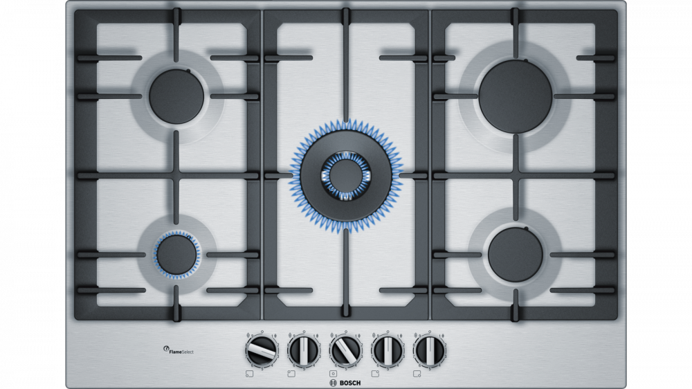 Газовая варочная панель Bosch PCQ7A5B90 изготовлена из нержавеющей стали, которая может выдерживать высокие температуры.