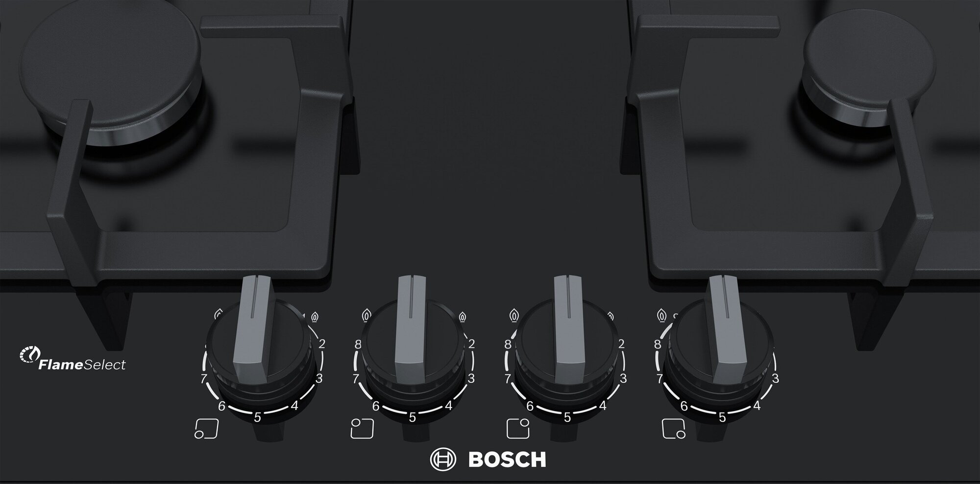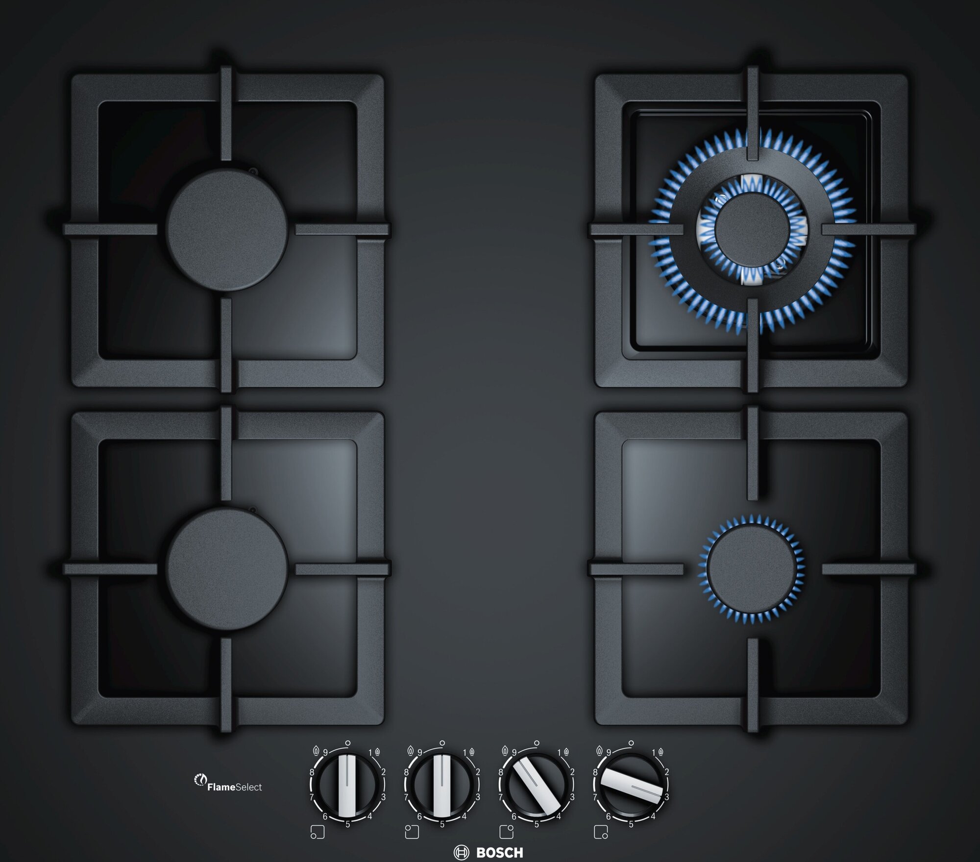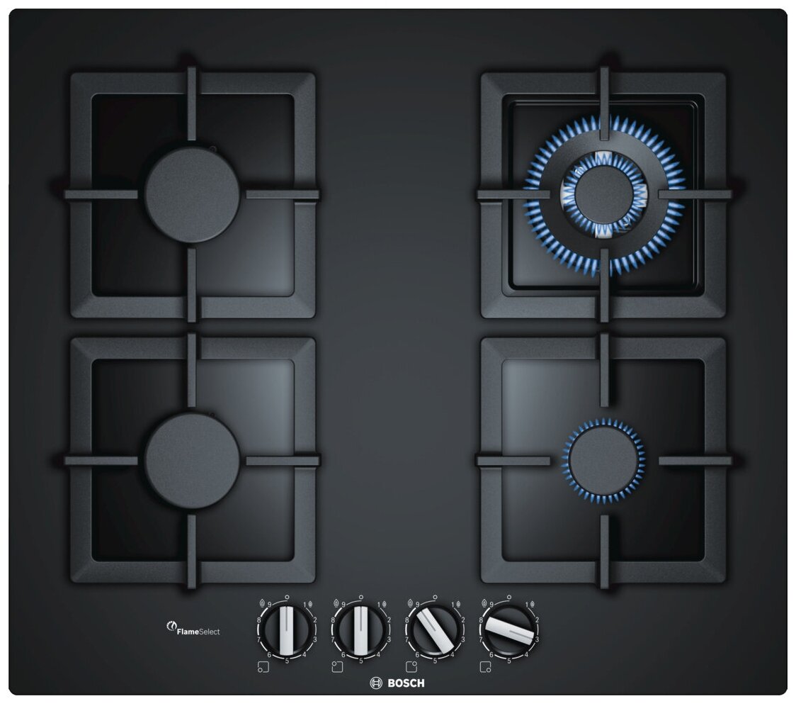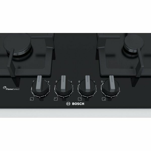 Газовая варочная панель Bosch PPH6A6B20 имеет рабочую поверхностью из закаленного стекла.