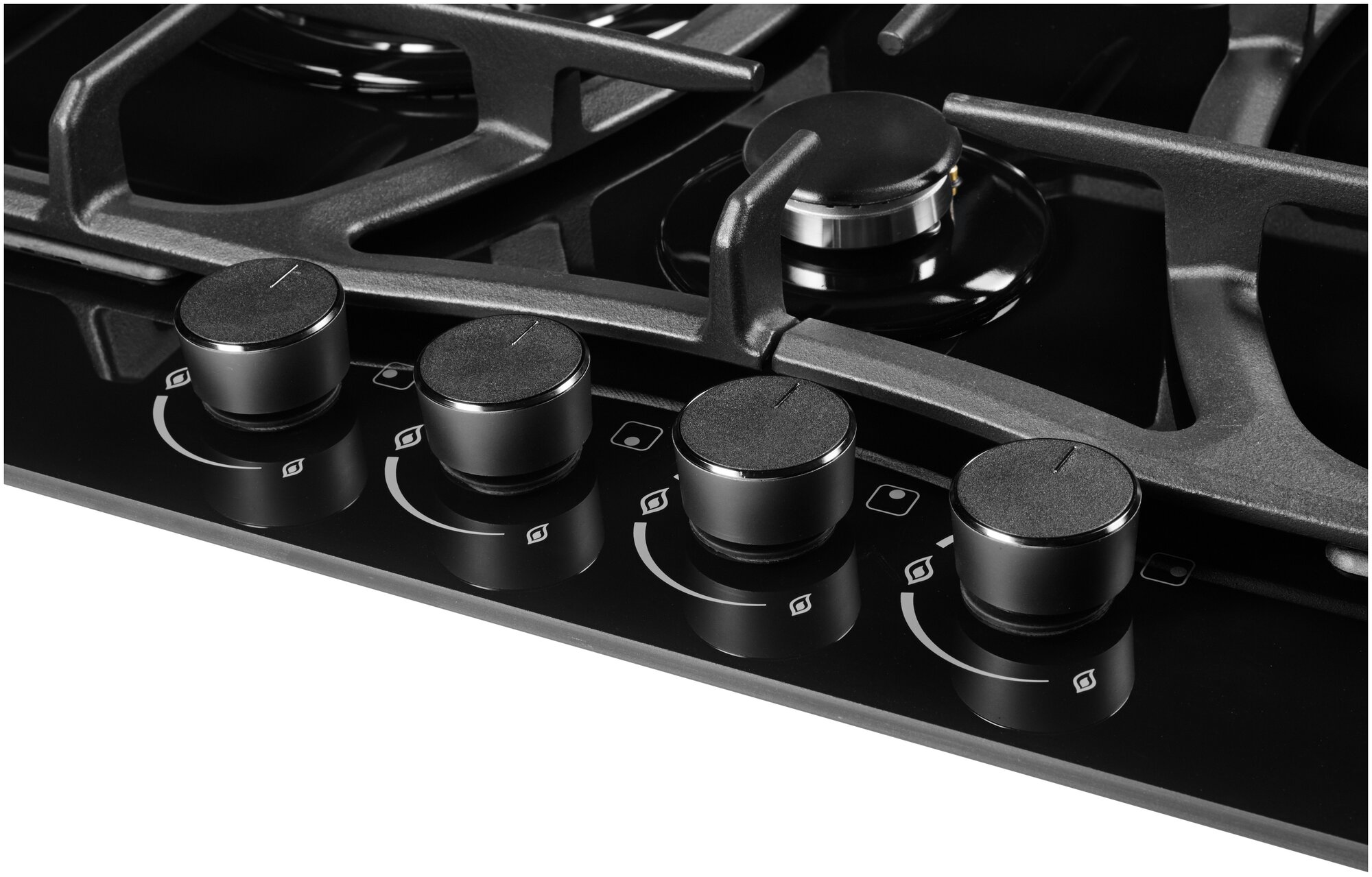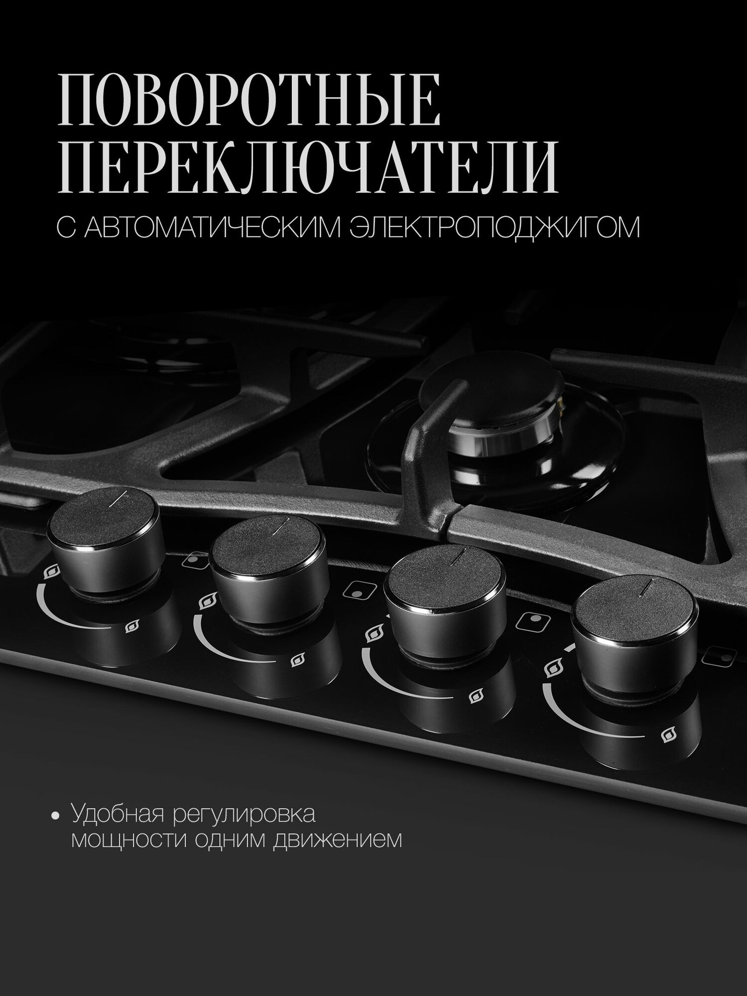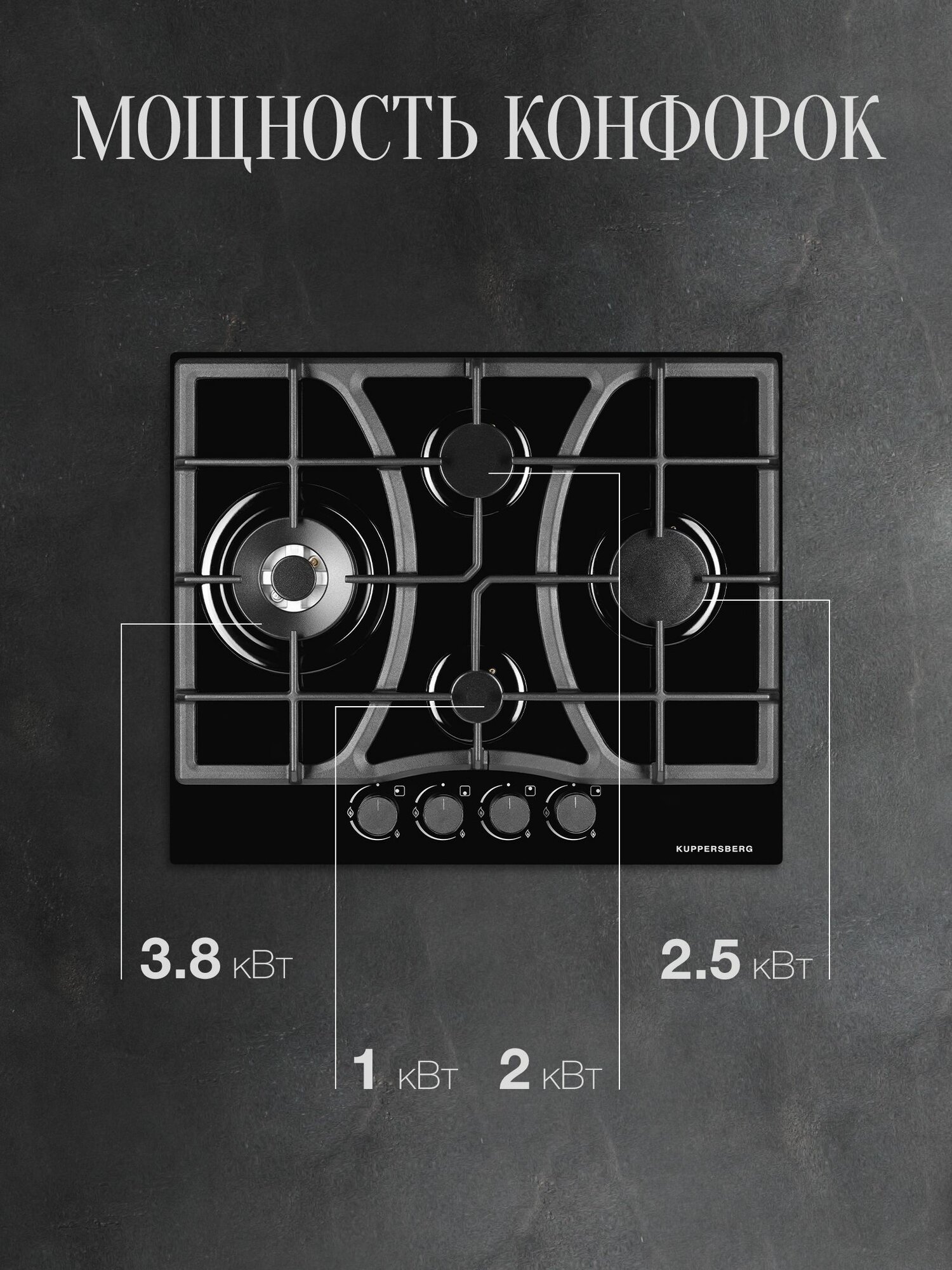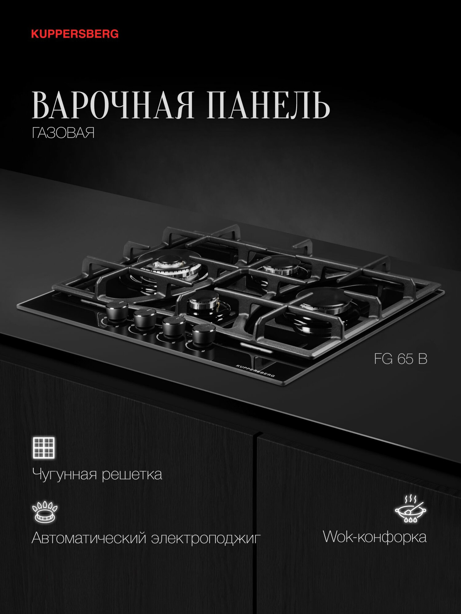 Варочная панель Kuppersberg FG 65 B шириной 61 см оснащена 4 газовыми конфорками. Горелка WOK работает на 3,8 кВт. Интенсивность пламени выбирается поворотными переключателями.