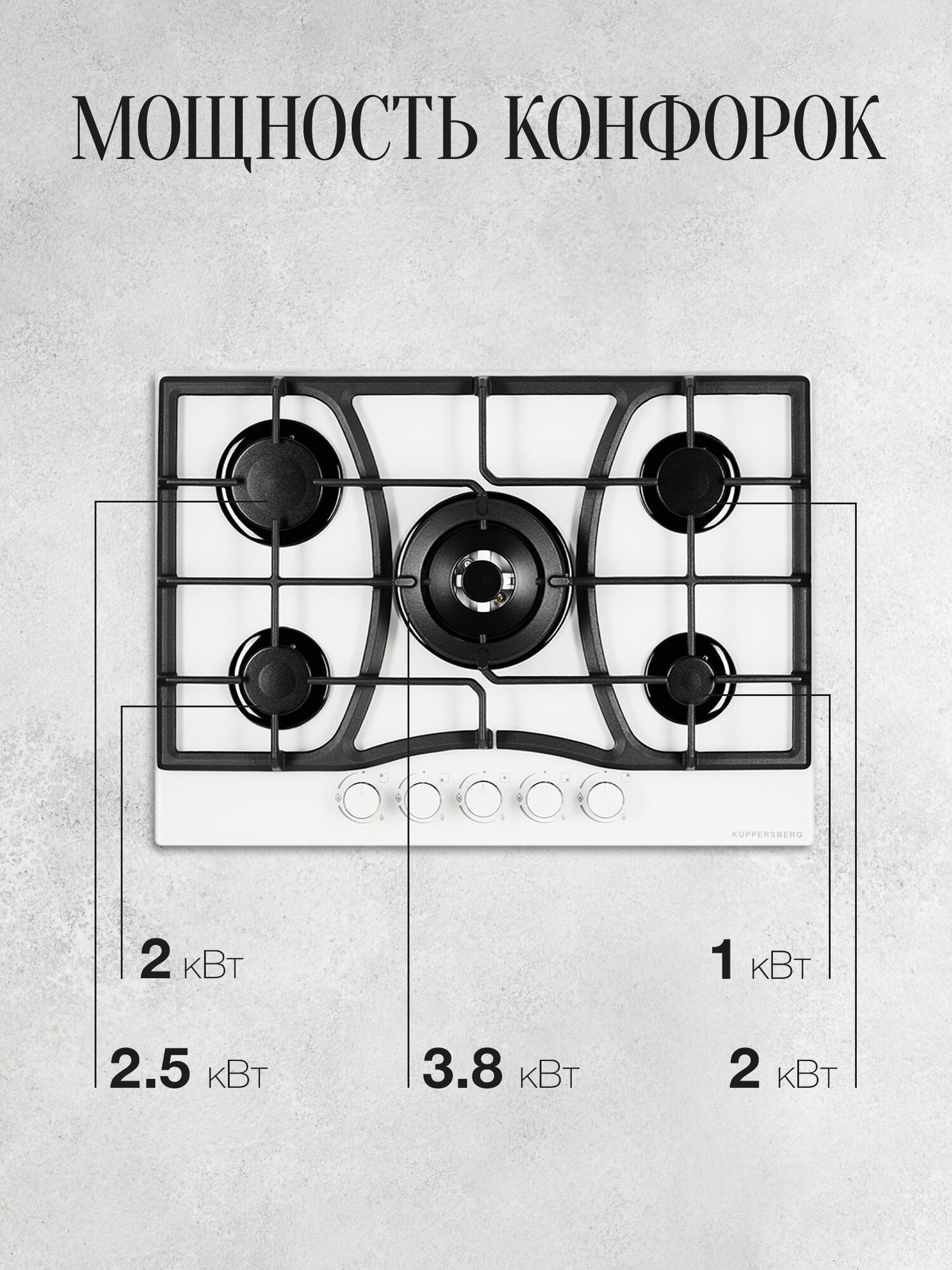 мощность конфорок: передняя левая 2.0 кВт, передняя правая 1,0 кВт, средняя 3,8 кВт, задняя левая 2.5 кВт, задняя правая 2.0 кВт, WOK 3,8 кВт