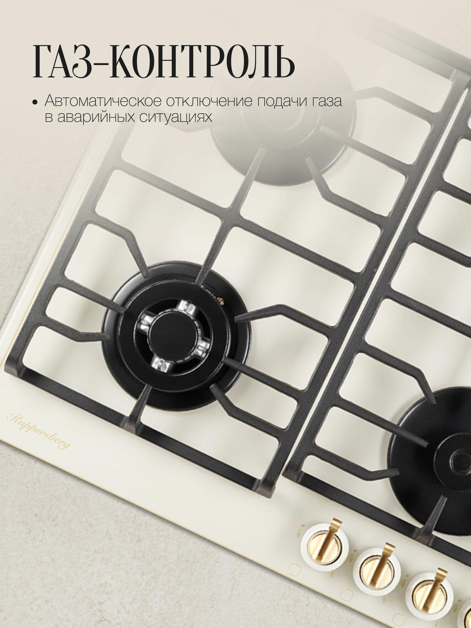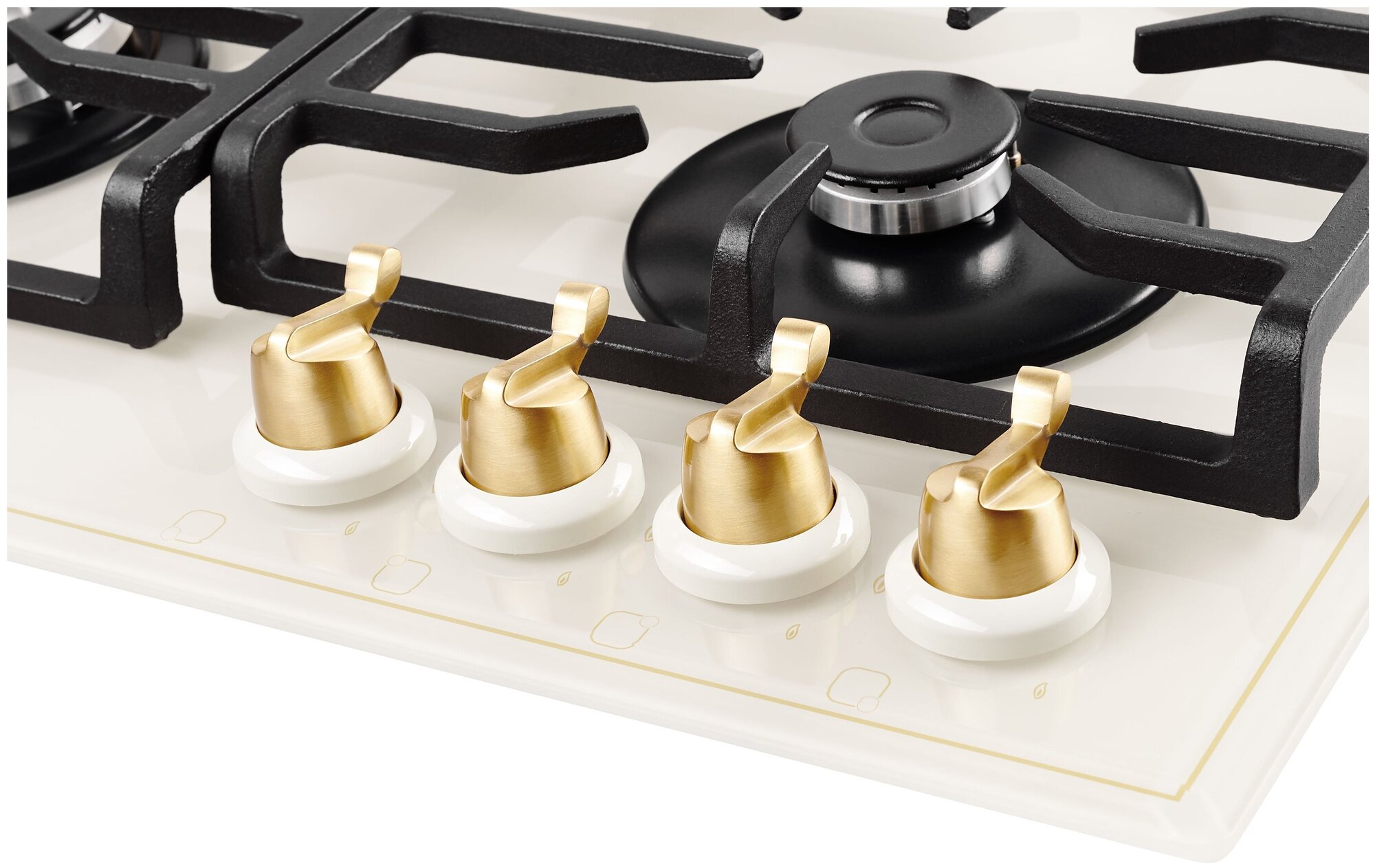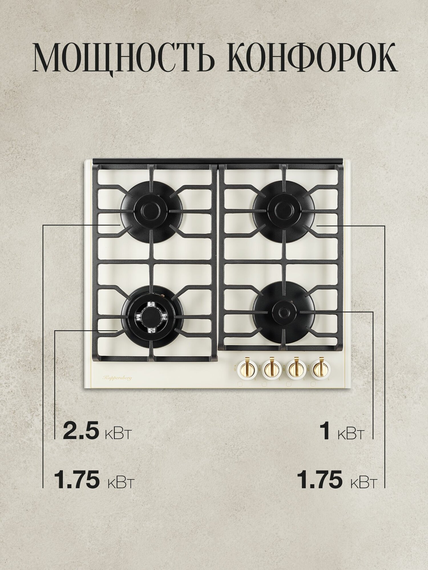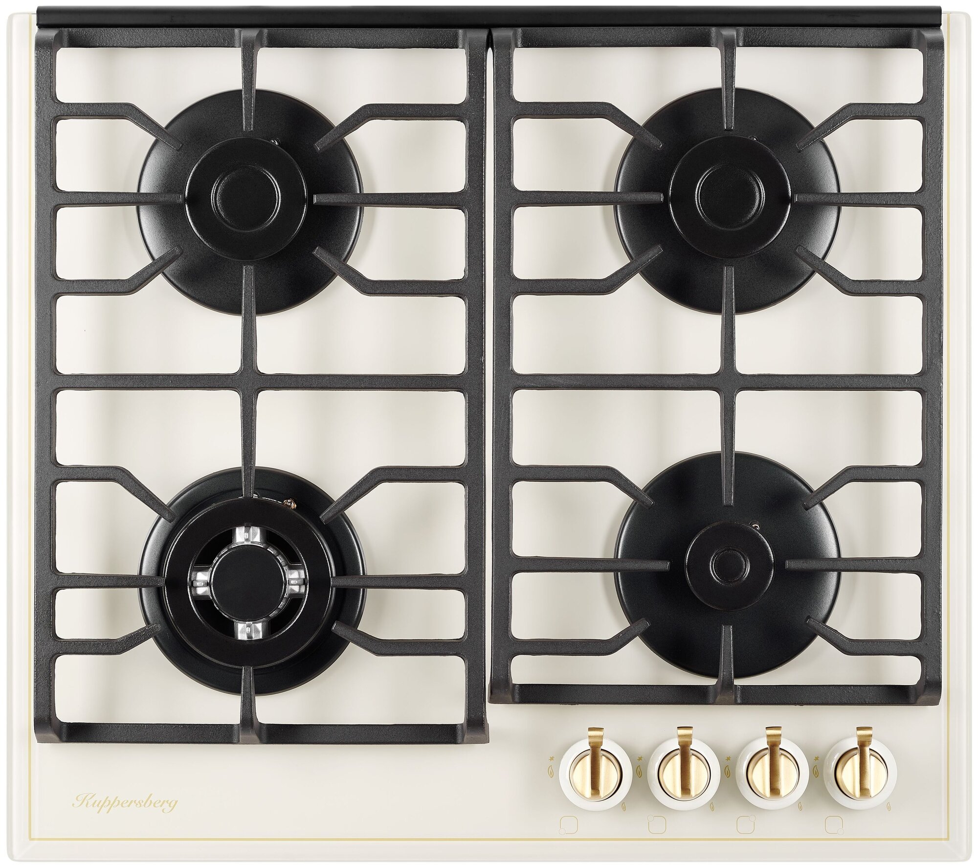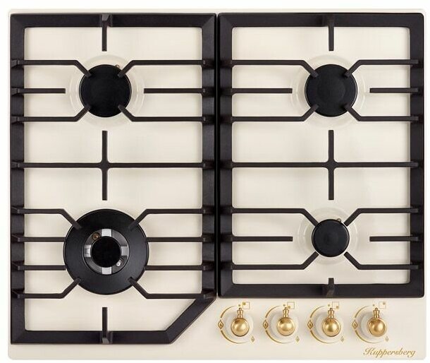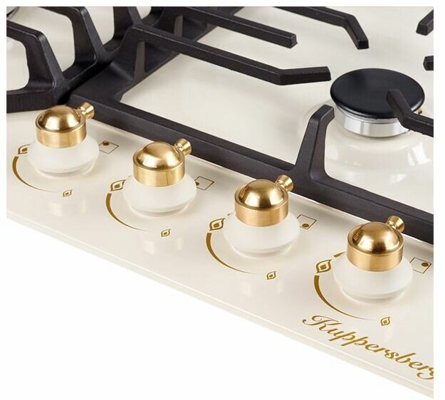 Газовая плита Kuppersberg FQ 602 C изготовлена из закаленного стекла бежевого цвета. Спереди слева - горелка WOK мощностью 2,5 кВт.