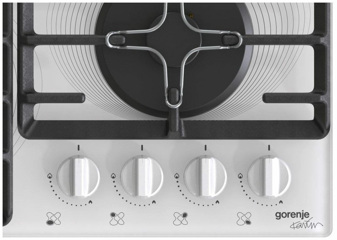 Газовая варочная панель Gorenje GTW641KR принадлежит к коллекции Карима Рашида, созданной известным промышленным дизайнером. На самой поверхности можно увидеть узор, разработанный специально для этой линии. Автограф разработчика находится в правом нижнем углу.