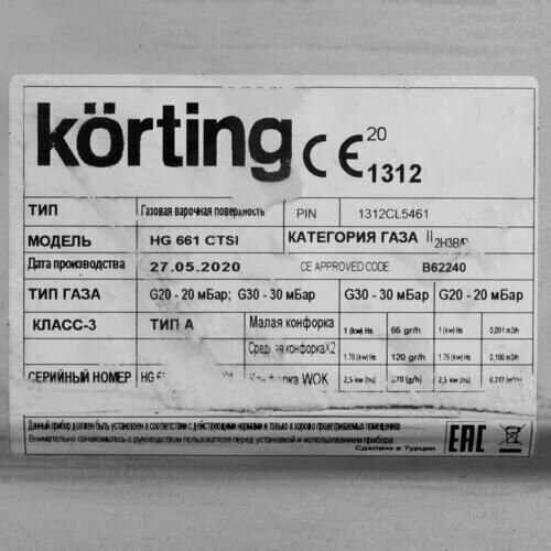 Скачать документы для Газовая варочная панель Korting HG 661 CTSI