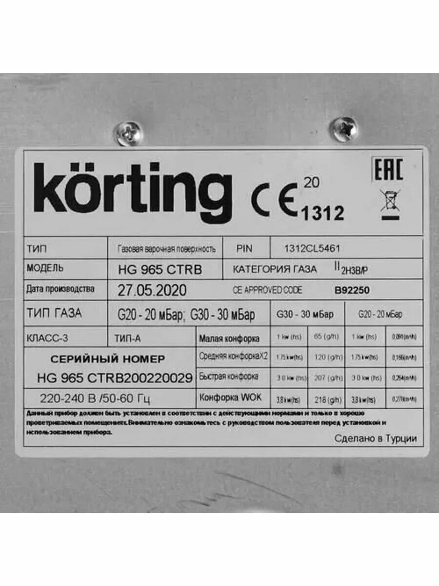 Скачать документы для Газовая варочная панель Korting HG 965 CTRB