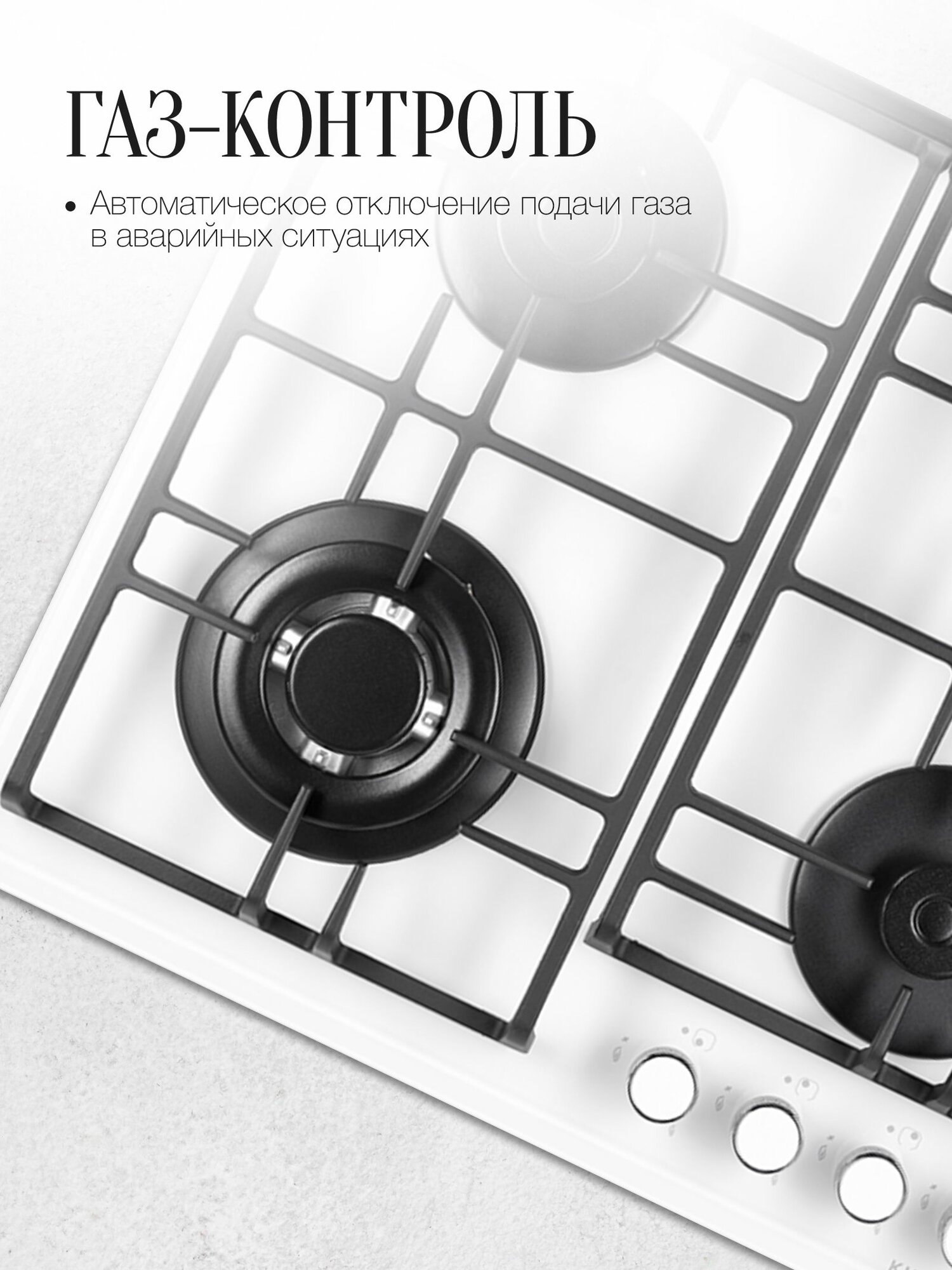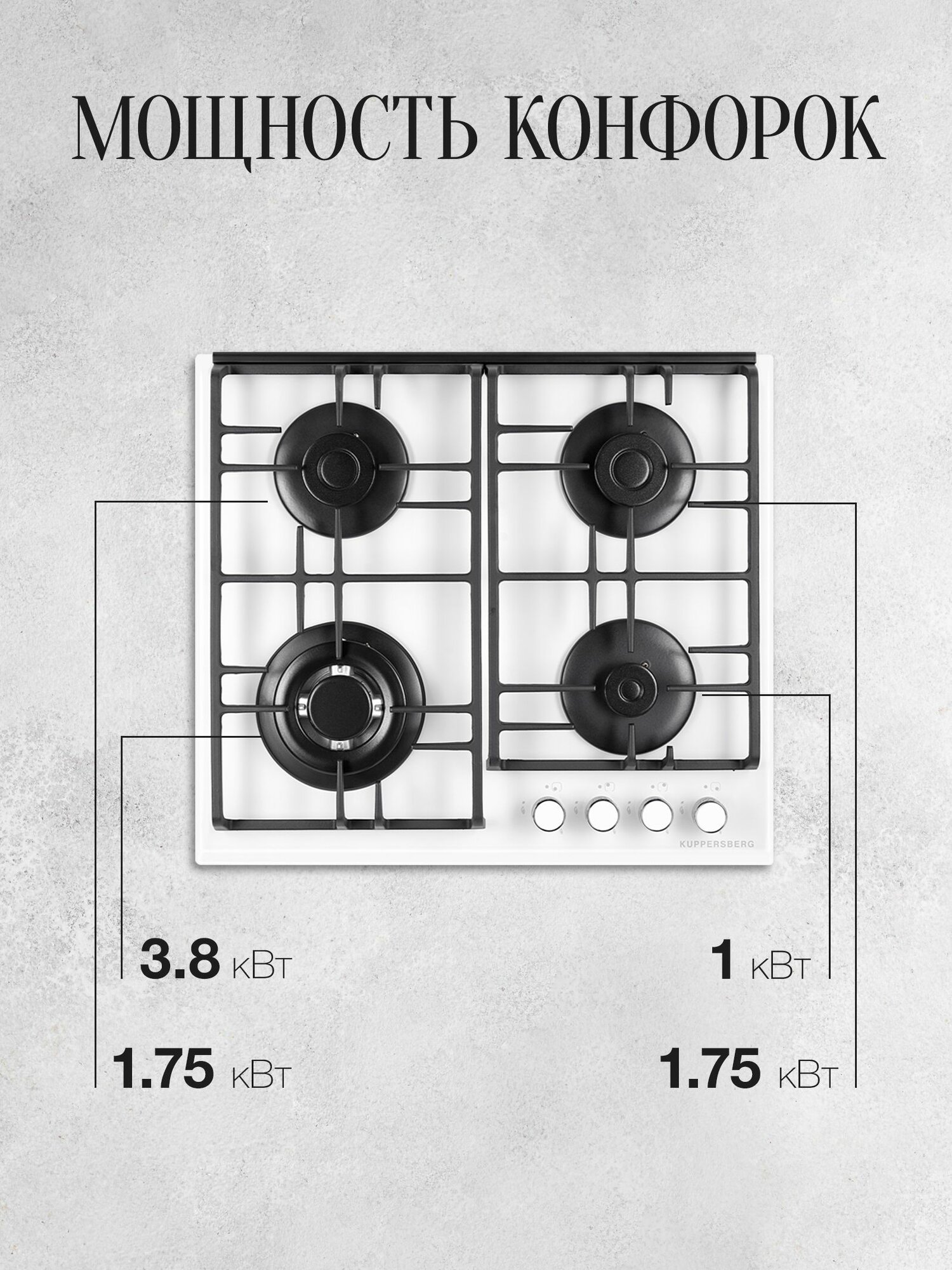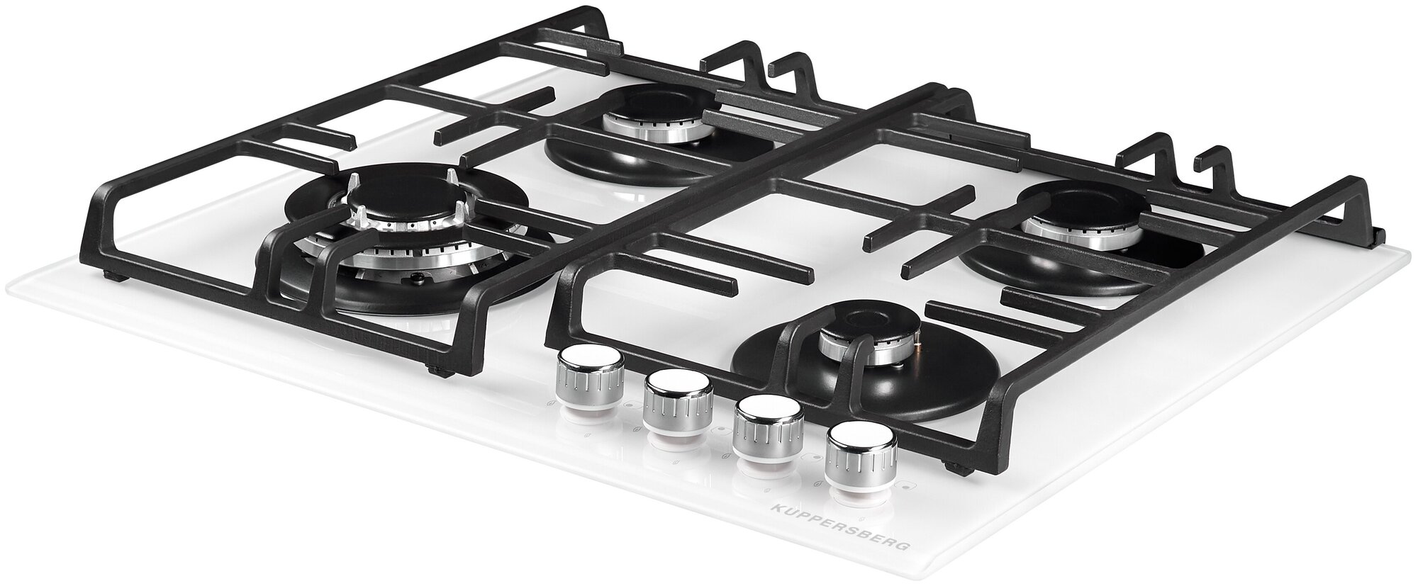Белая газовая плита Kuppersberg FQ 63 W - модель из серии газ на стекле. Гладкая поверхность проста в уходе и чистке. Газ-контроль и электрический розжиг обеспечивают безопасность и комфорт.