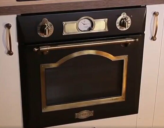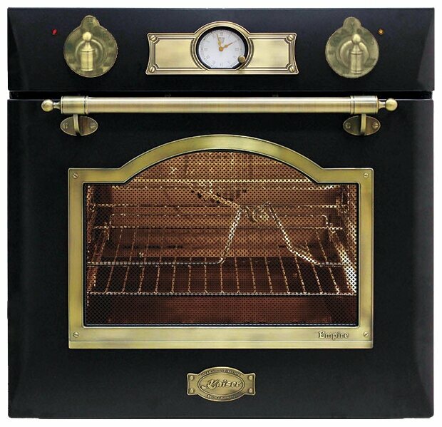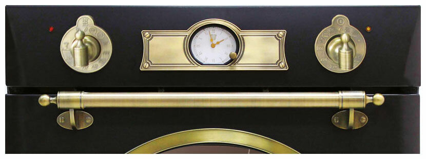 размораживание, таймер, Вентилятор охлаждения, Встроенные часы, Дизайн Ретро, Полностью стеклянная внутренняя дверца, Рецепты на двери, Хромированные направляющие, Электромеханический вертел
