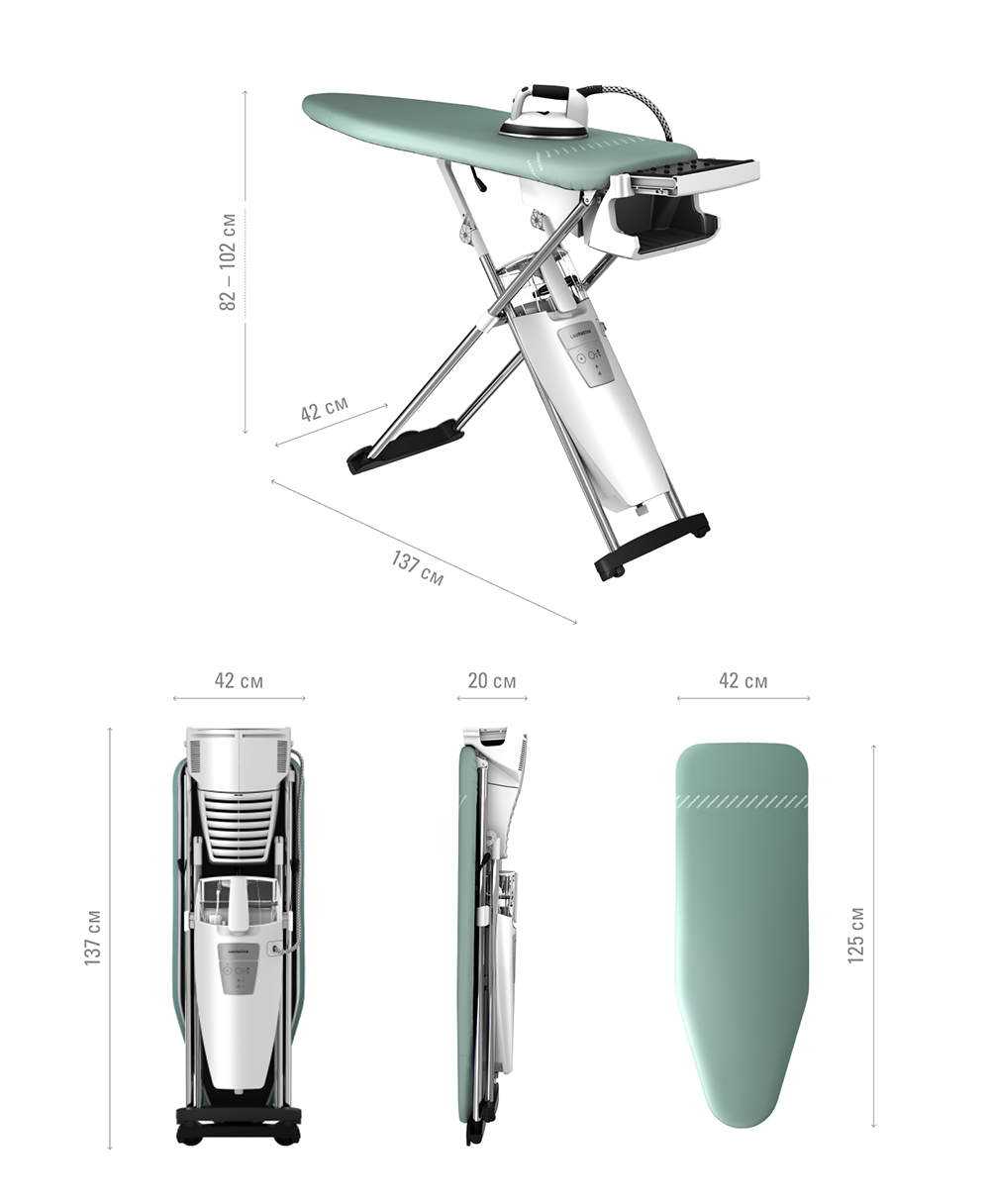 держатель парового шланга, индикация готовности к работе, индикация уровня воды, колесики, регулировка высоты доски, складная конструкция, съемный резервуар для воды, фильтр для воды, долив воды во время работы, складная