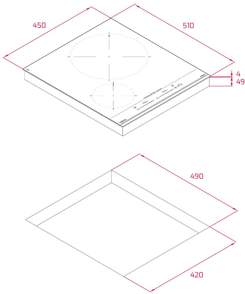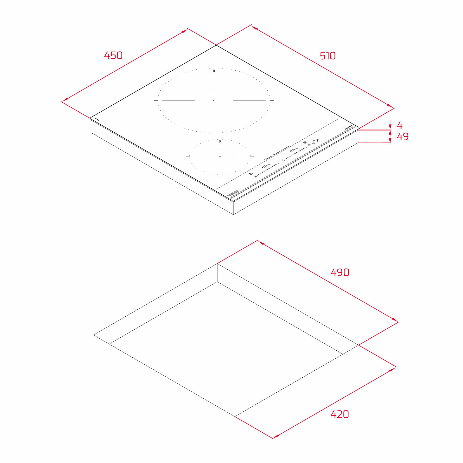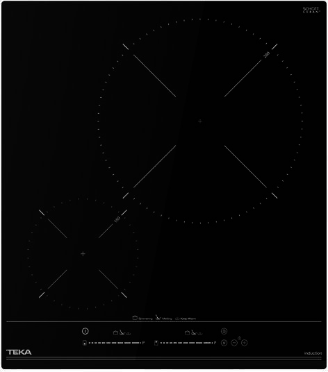 1 индукционная зона Ø 280 мм (2,1/2,5 кВт), 1 индукционная зона Ø 150 мм (1,2/1,6 кВт)