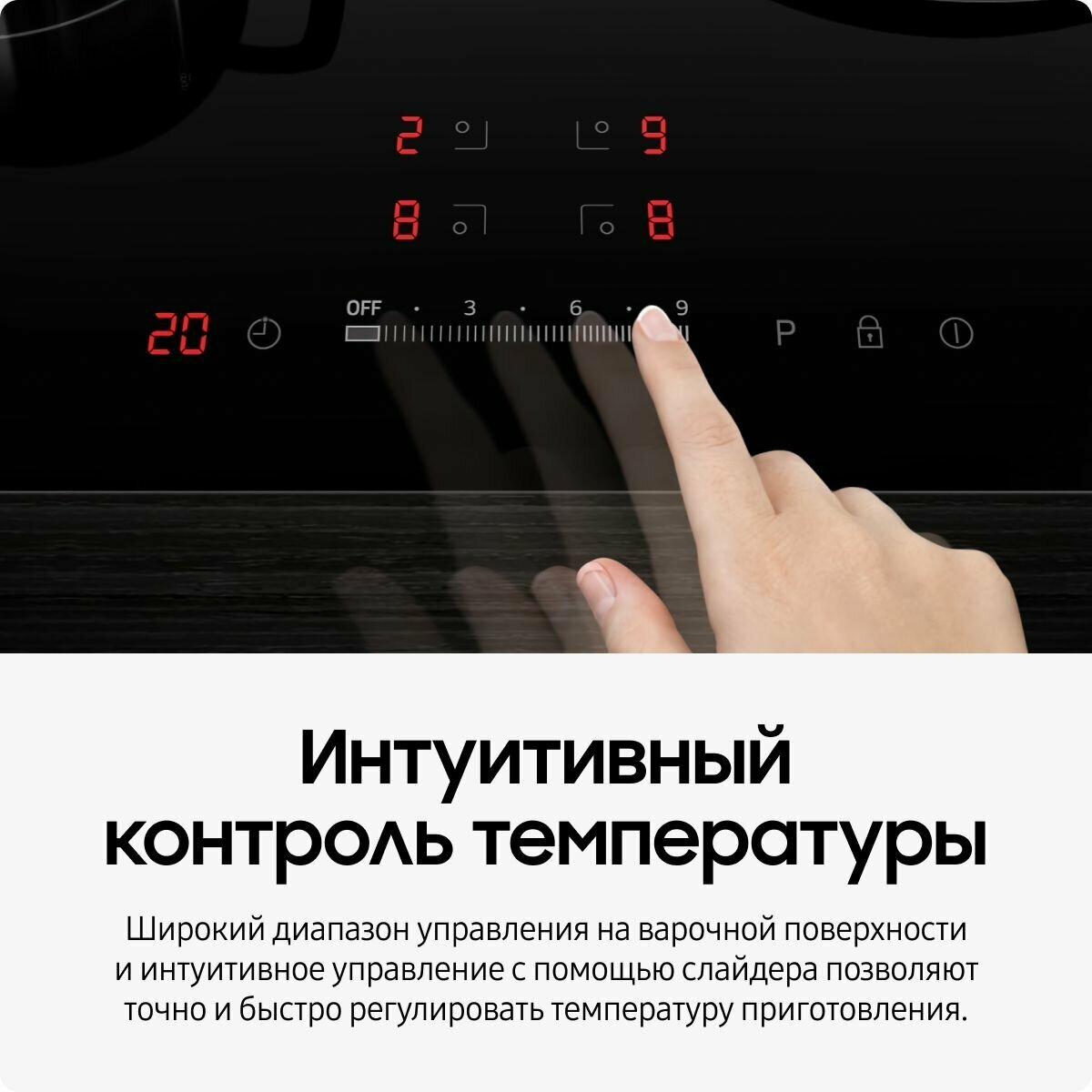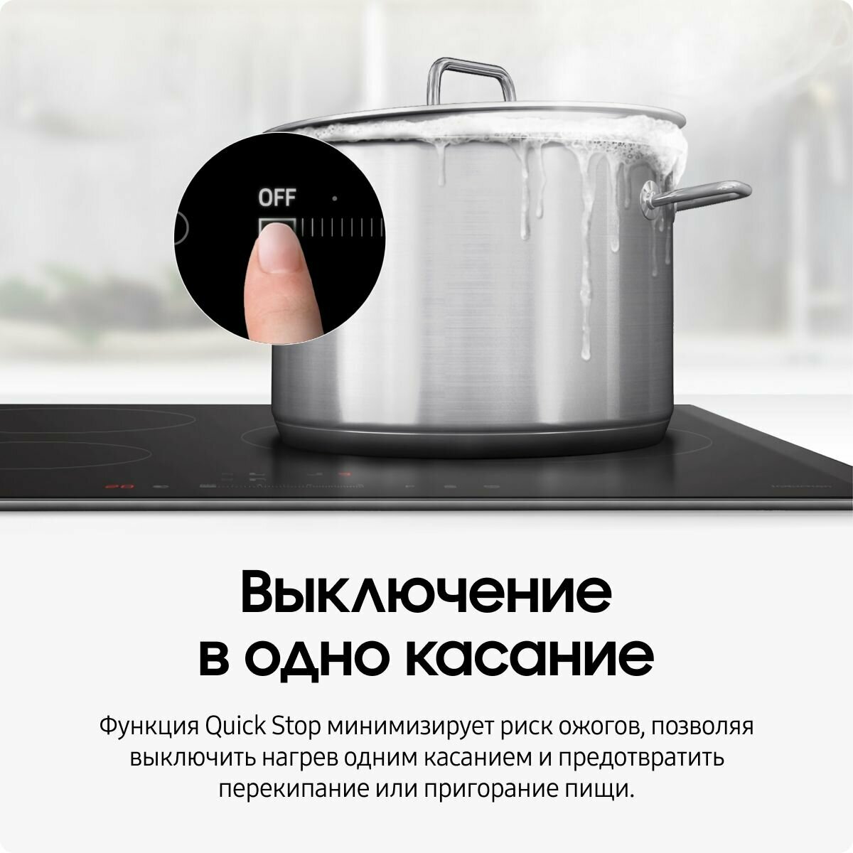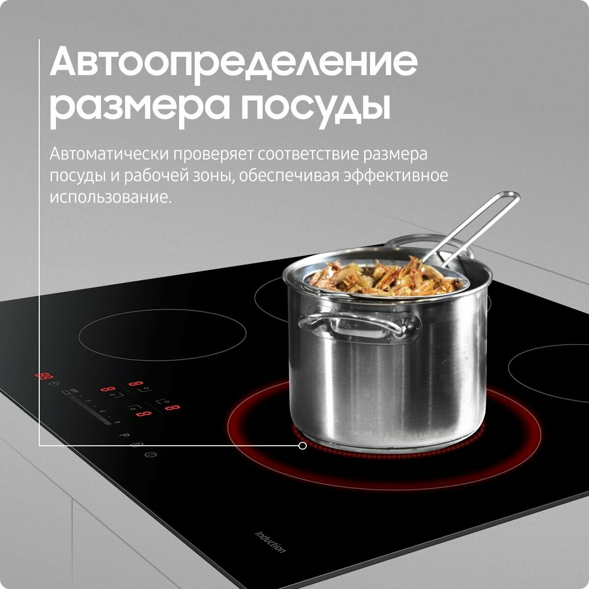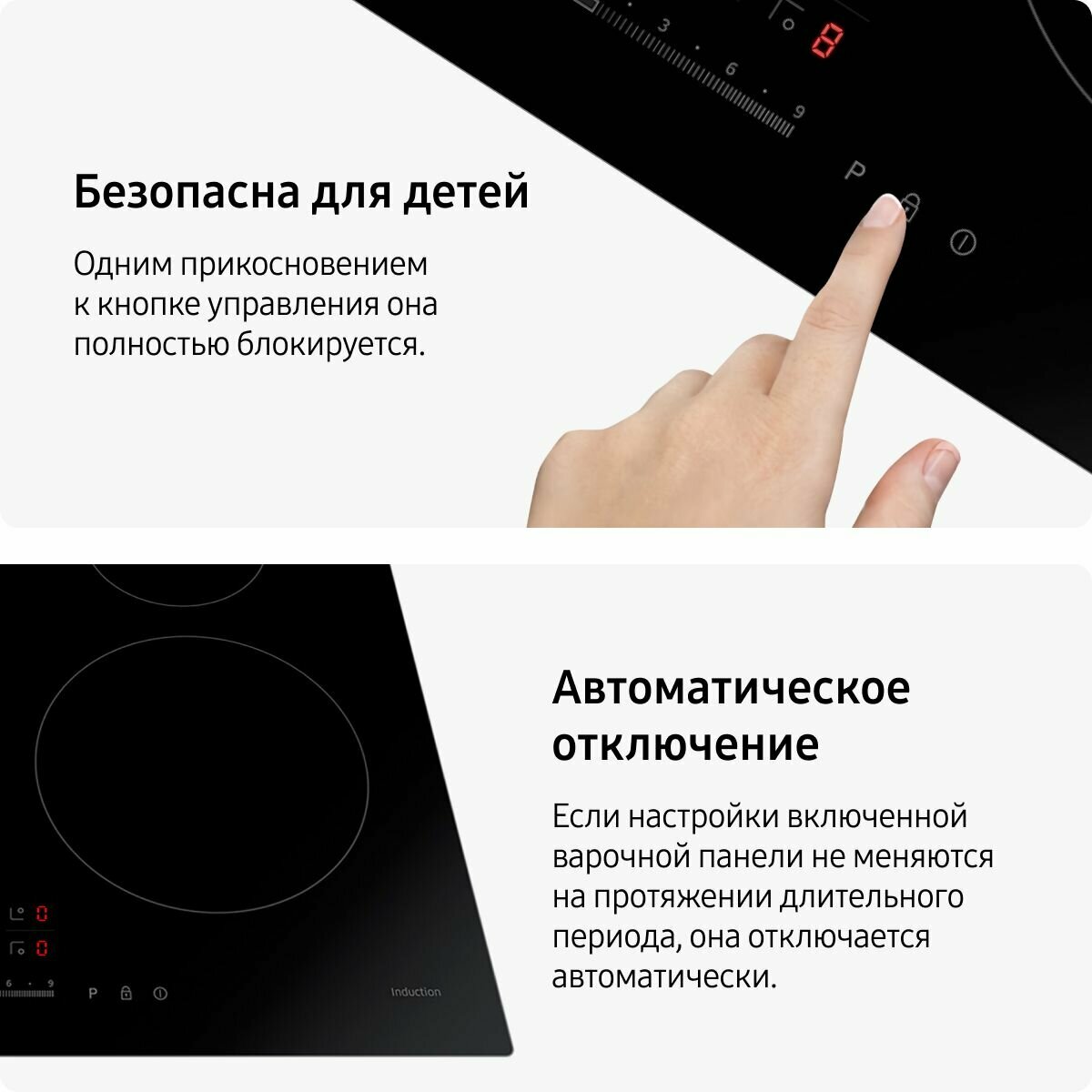 автоматическое определение размера посуды, блокировка от детей, дисплей для каждой зоны нагрева, защита от детей, индикаторы остаточного тепла