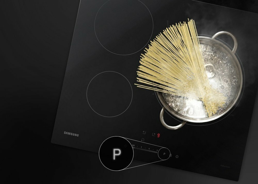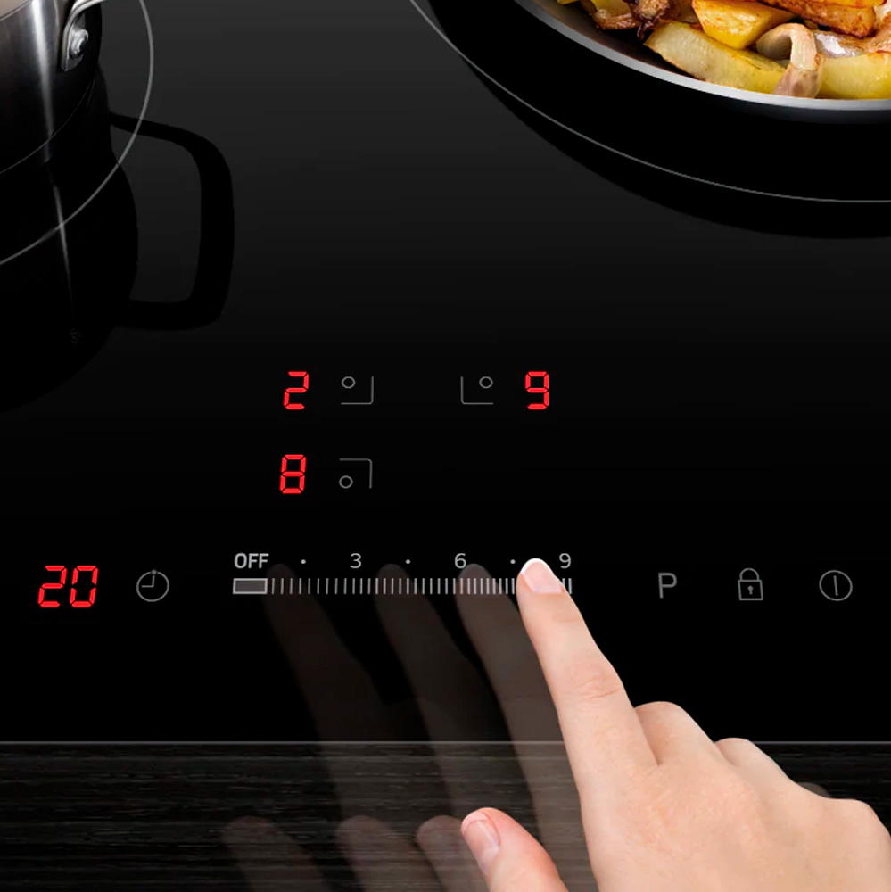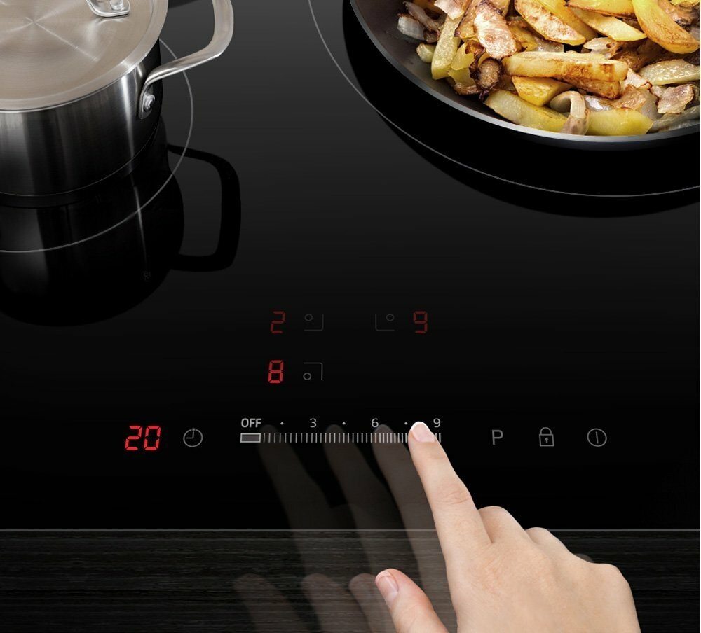 распознавание наличия посуды, распознавание размера посуды, таймер, функция Booster, Быстрый нагрев, Индукционный мост, Расширение зоны нагрева