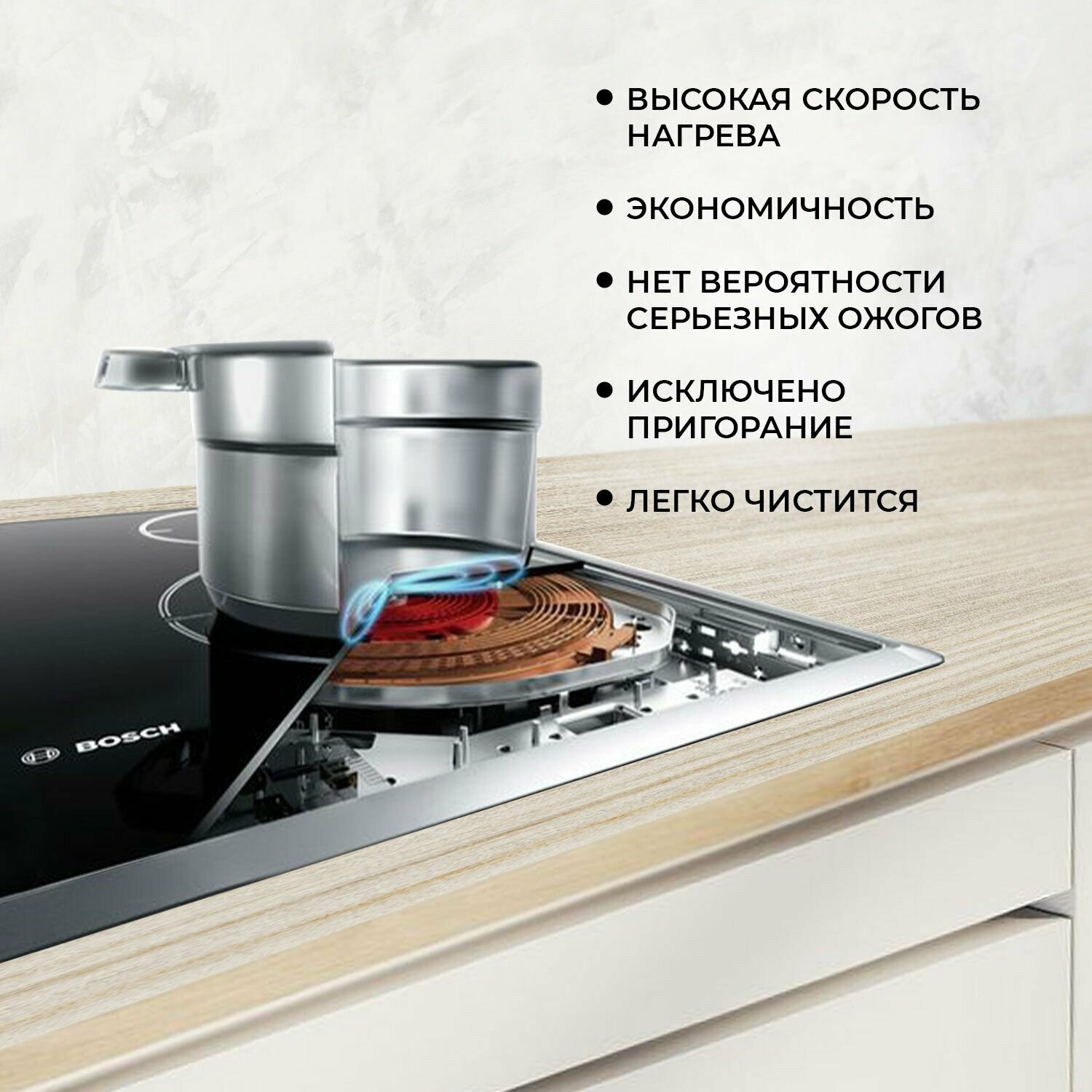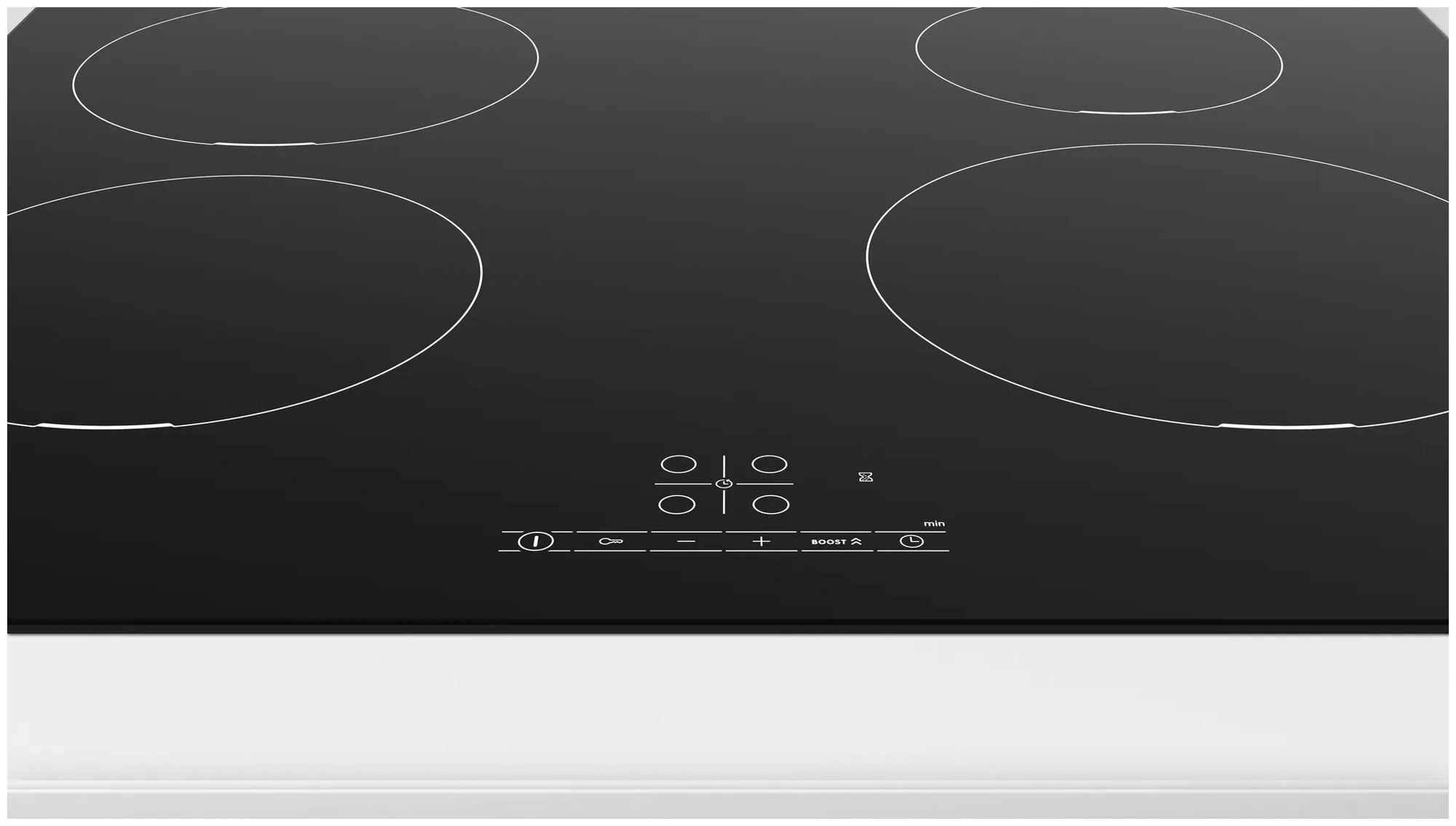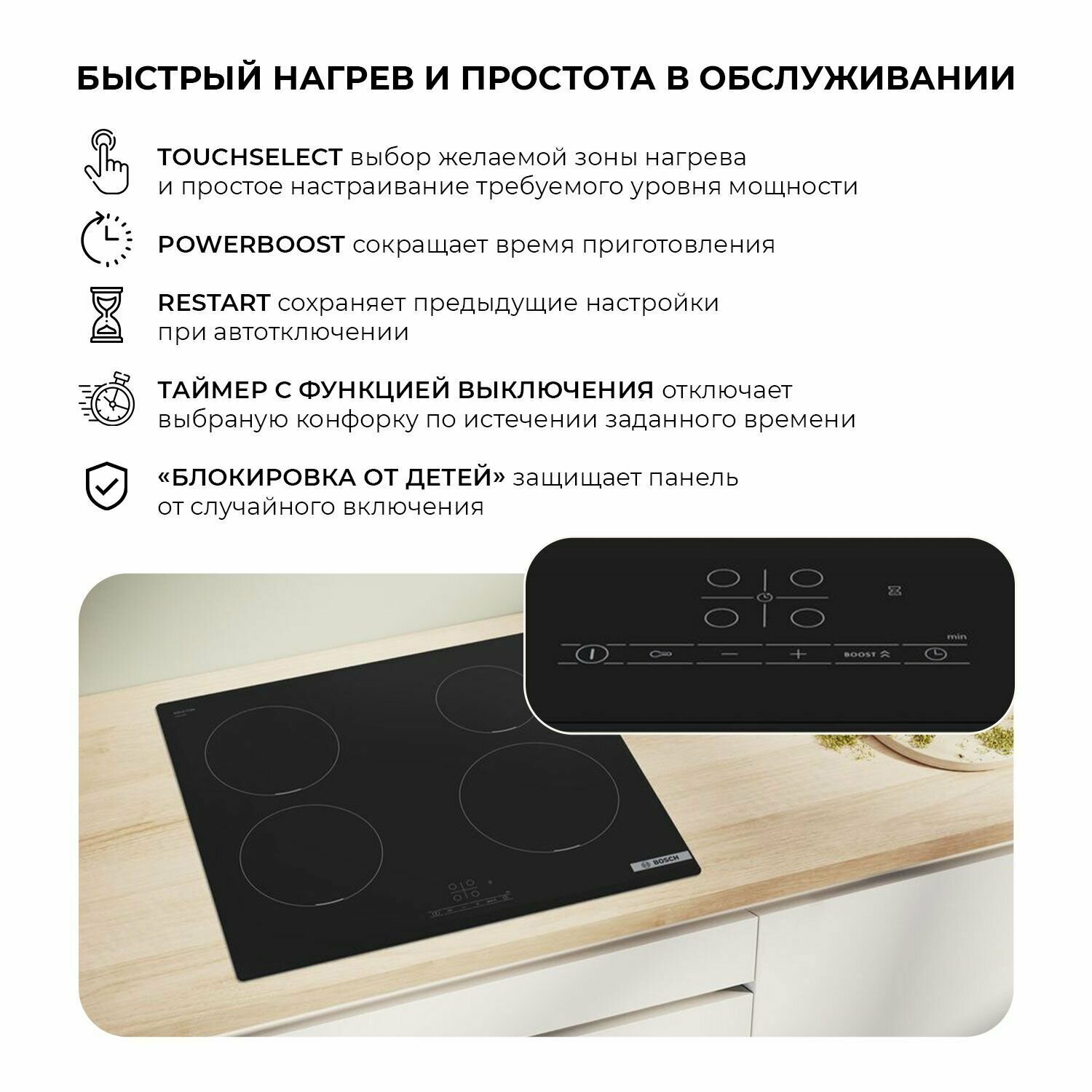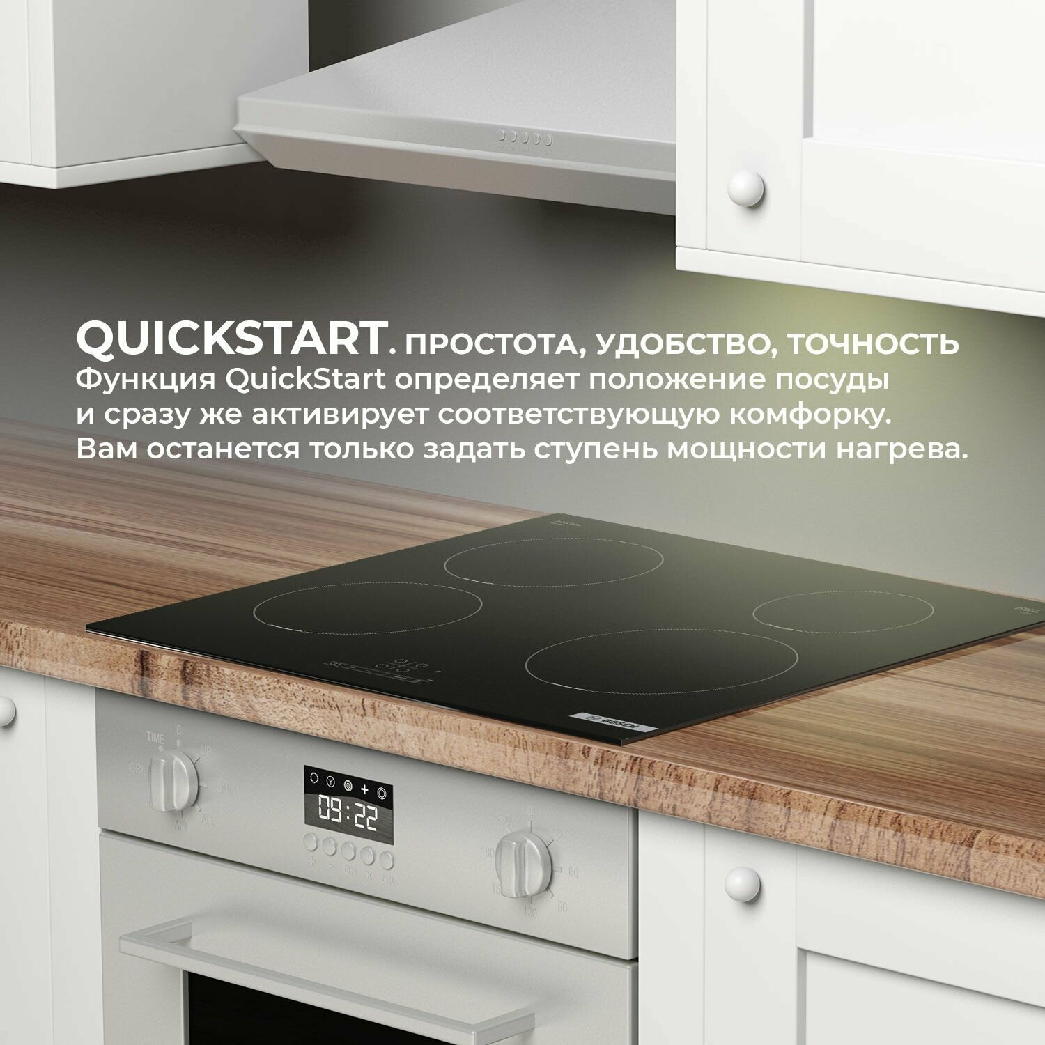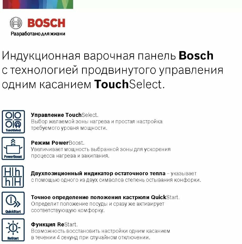 управление TouchSelect; функция ReStart; 17 ступеней мощности: точная регулировка уровней мощности с помощью 17 уровней (9 основных уровней и 8 промежуточных уровней); функция quickStart сама активирует конфорку, на которой установлена посуда : при включении варочная панель автоматически выбирает конфорку с посудой (в выключенном состоянии)