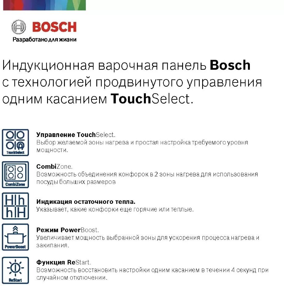 кратковременная пауза, наличие вытяжки, распознавание наличия посуды, таймер, функция Booster, функция ReStart, Booster, Быстрый нагрев, Индукционный мост, Расширение зоны нагрева, автоотключение, блокировка, индикатор остат. тепла, огранич-ль температуры, регул. мощности