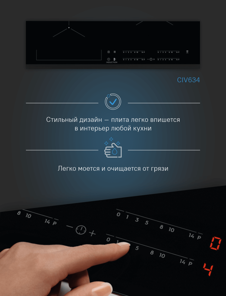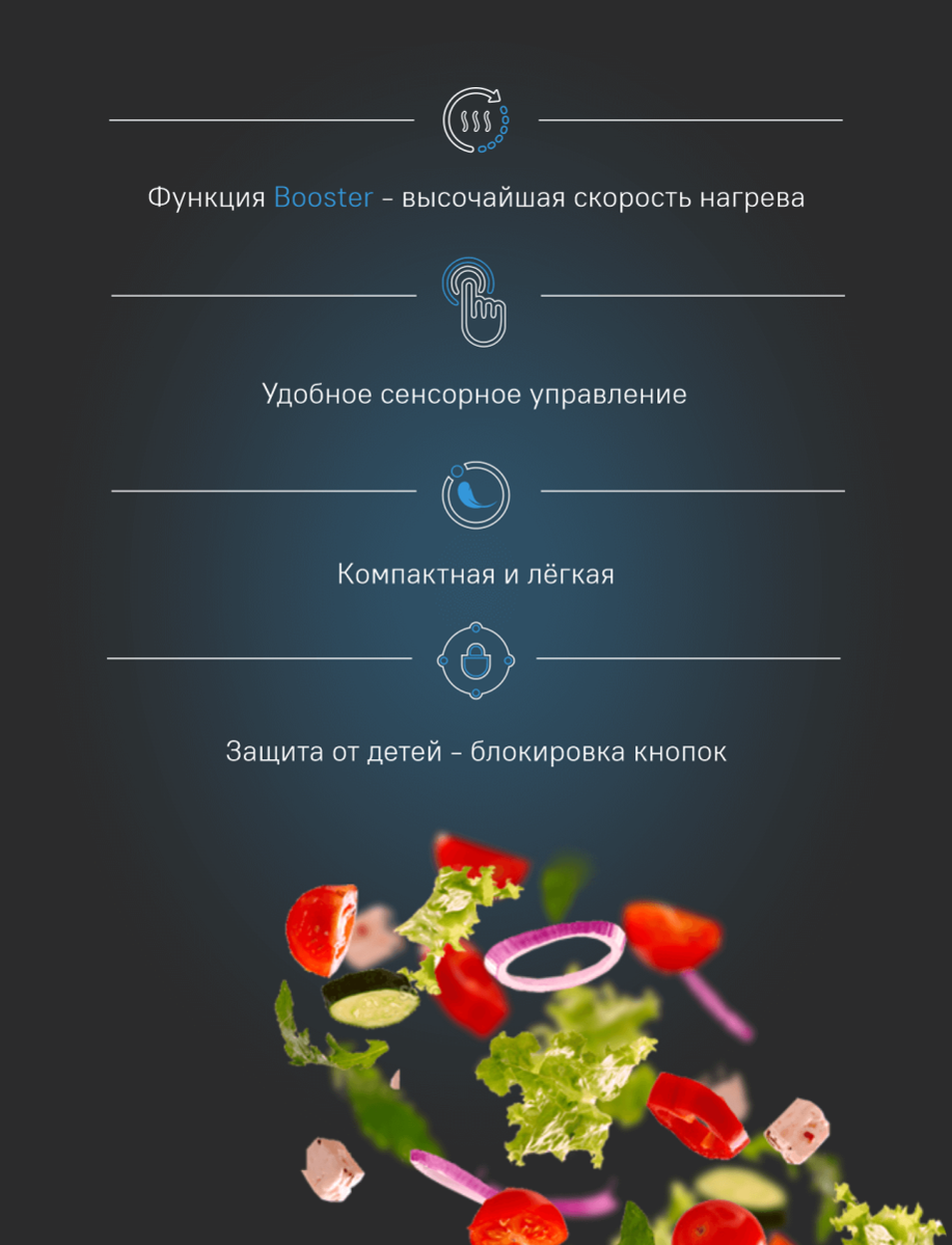 кратковременная пауза, распознавание наличия посуды, таймер, функция Booster, функция Bridge, Быстрый нагрев, Индукционный мост, автоотключение, блокировка, индикатор остат. тепла, огранич-ль температуры, регул. мощности