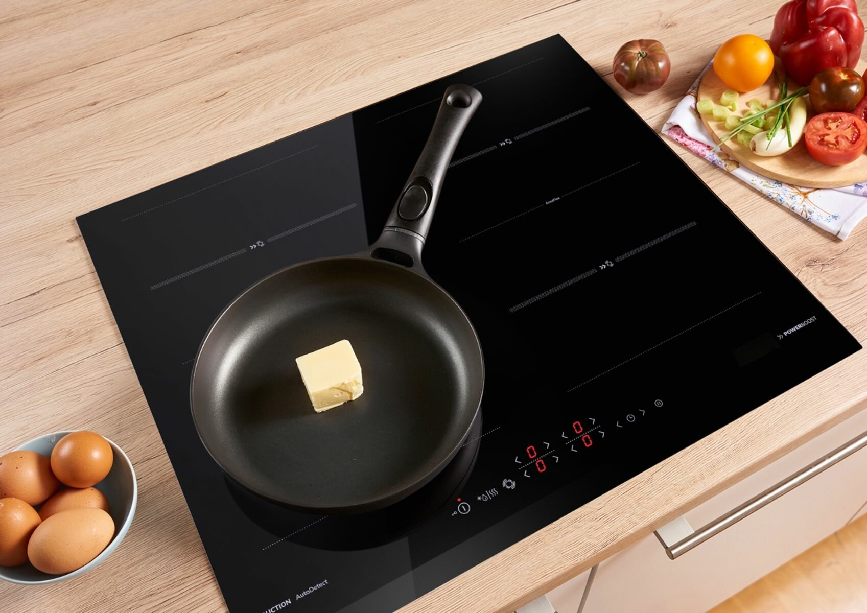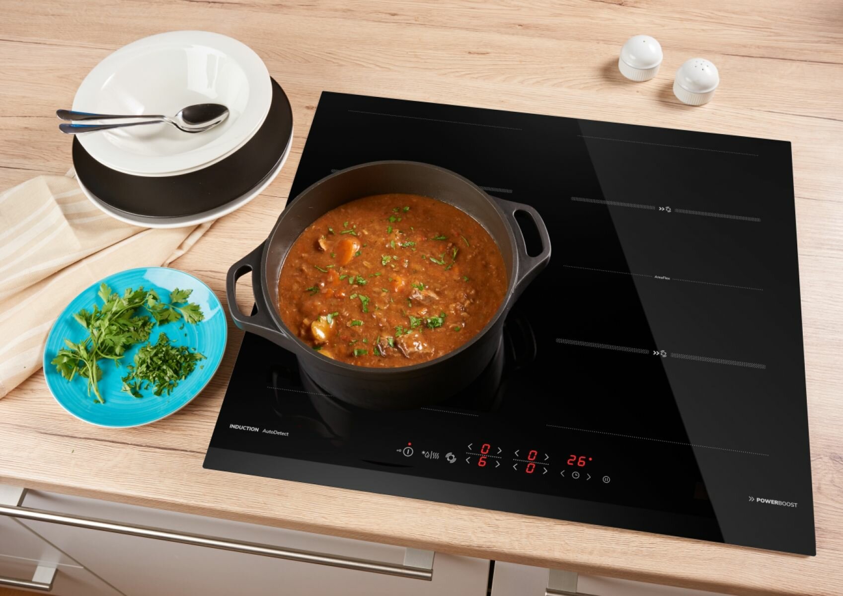 автоматика закипания, кратковременная пауза, поддержание тепла, распознавание наличия посуды, распознавание размера посуды, таймер, функция Booster, функция ReStart, Быстрый нагрев, Индукционный мост, Расширение зоны нагрева, индикатор остат. тепла, таймер, регул. мощности, автоотключение