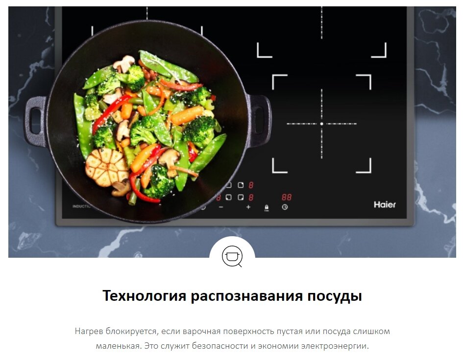 поддержание тепла, распознавание наличия посуды, распознавание размера посуды, таймер, Быстрый нагрев, Расширение зоны нагрева
