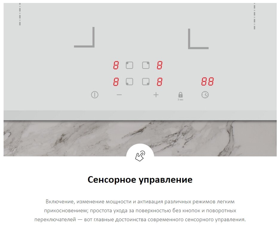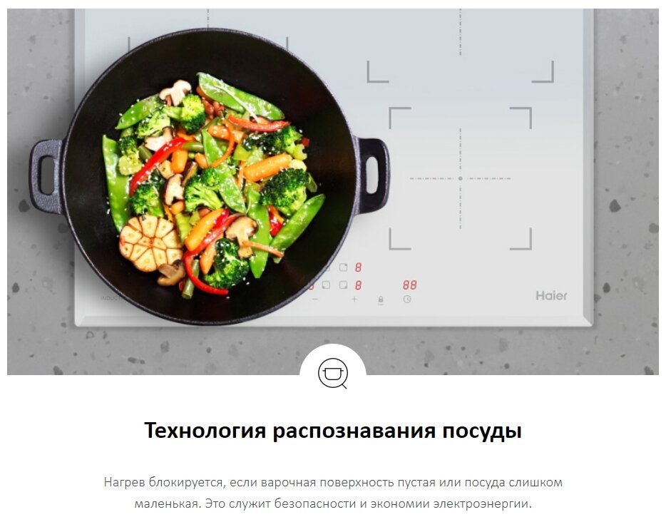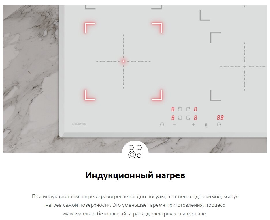 импульсный индукционный нагрев, непрерывный индукционный нагрев, 9 уровней мощности, блокировка от детей, индикаторы остаточного тепла, распознавание посуды