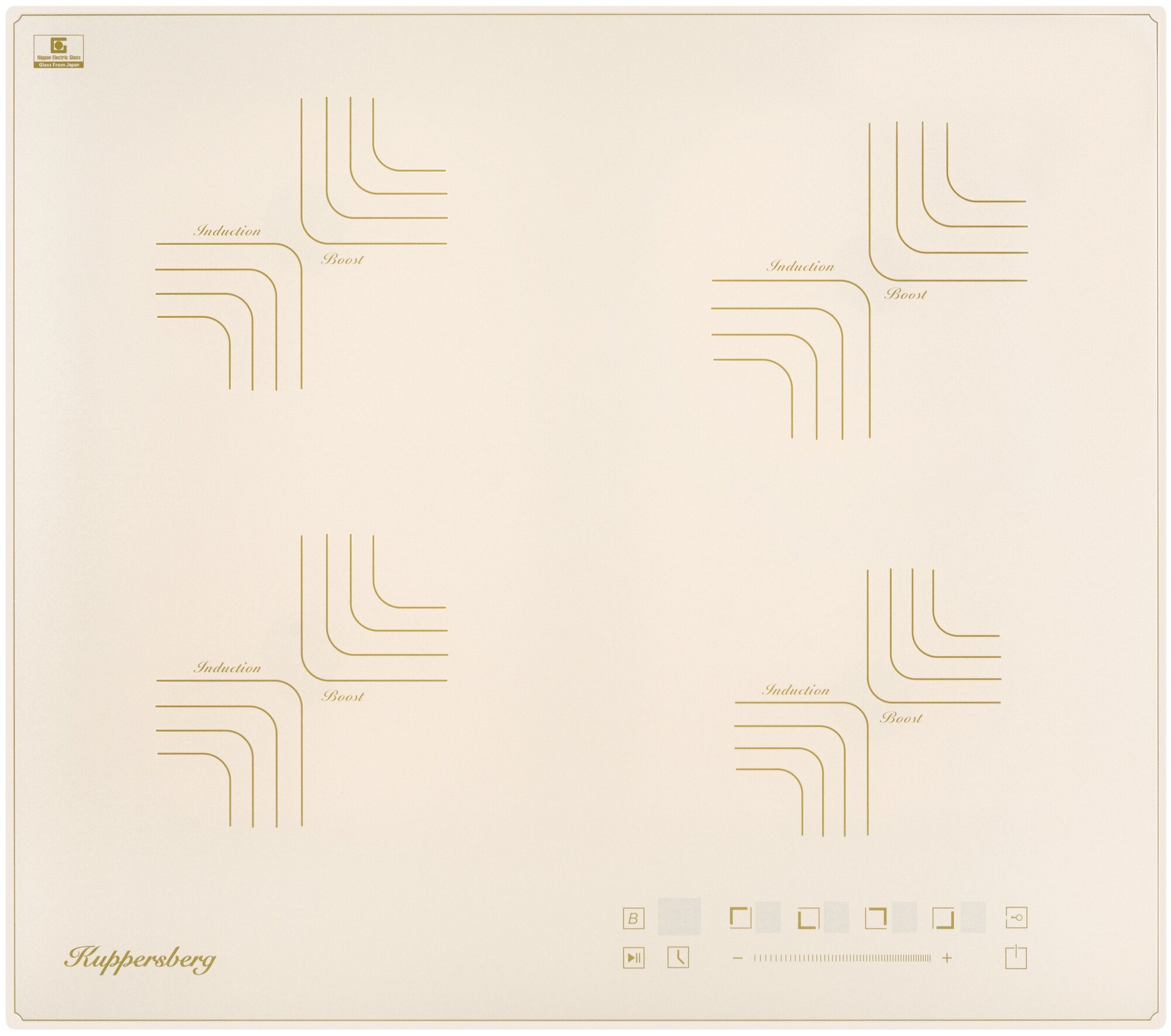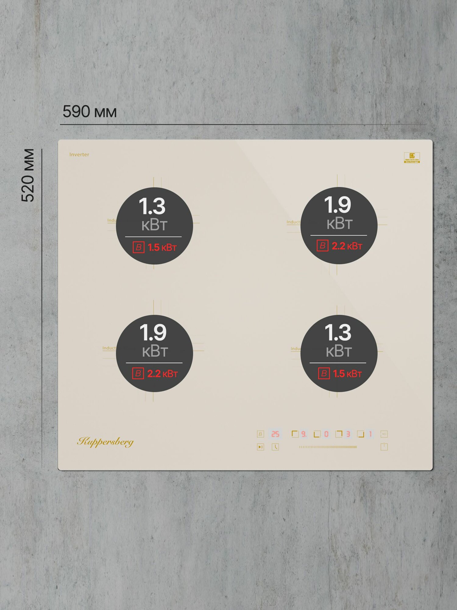 мощность передней левой и задней левой конфорок: 1.75 кВт (Booster 2.6 кВт), мощность передней правой конфорки: 1.5 кВт (Booster 2 кВт), мощность задней правой конфорки: 2 кВт (Booster 3 кВт); 5 цифровых дисплеев; 9 уровней мощности
