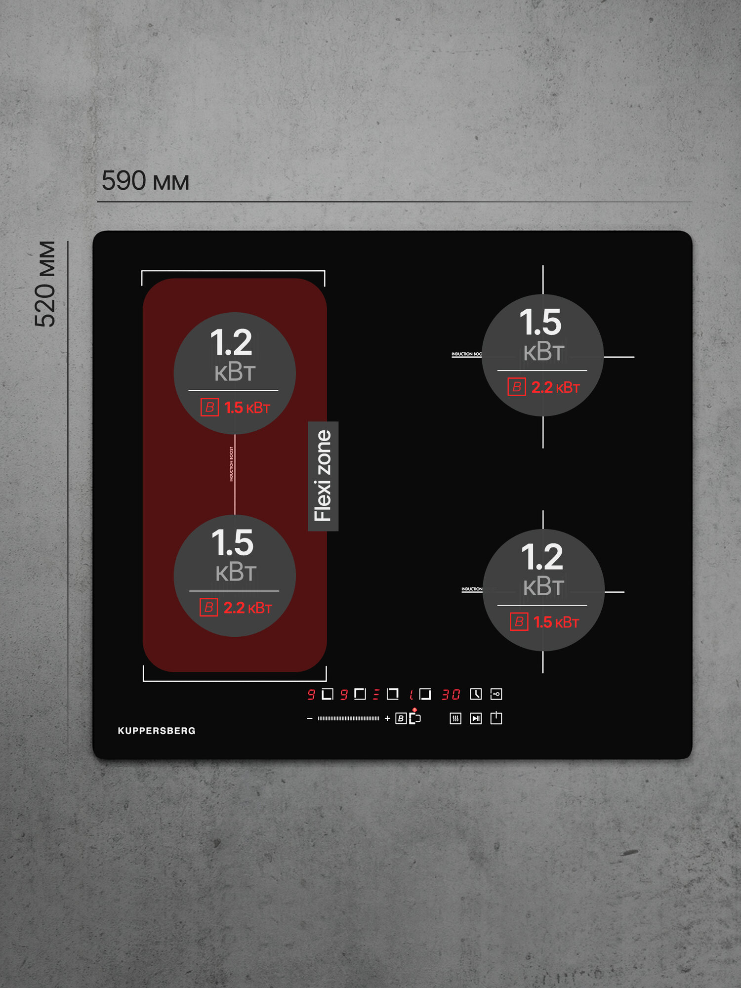 количество уровней мощности: 9, зона расширения позволяет использовать посуду разного размера и формы; вспомогательная функция готовки с 3 различными режимами: режим растапливание или разморозка (около 50°С), режим нагрев или поддержание температуры (около 70°С), режим тушения - температура близка к кипению, что полезно для медленного приготовления пищи (около 90°С); мощность конфорок: 180 мм - 1,5−2 кВт, 160 мм - 1,2−1,5 кВт