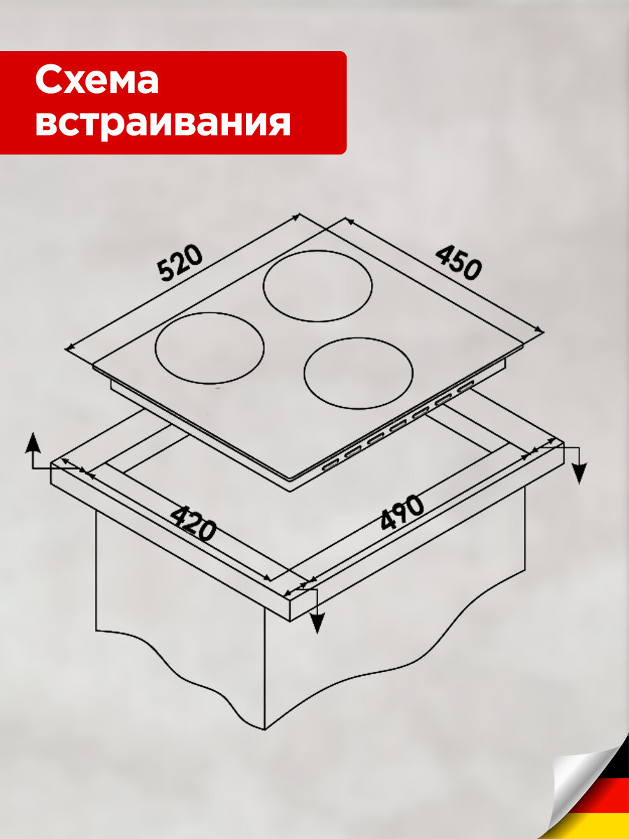 Одна конфорка диаметром 160 мм мощностью до 1500 Вт. Вторая конфорка диаметром 180 мм с мощностью до 2100 Вт. Третья конфорка – самая мощная, диаметром 210 мм и мощностью до 3000 Вт.