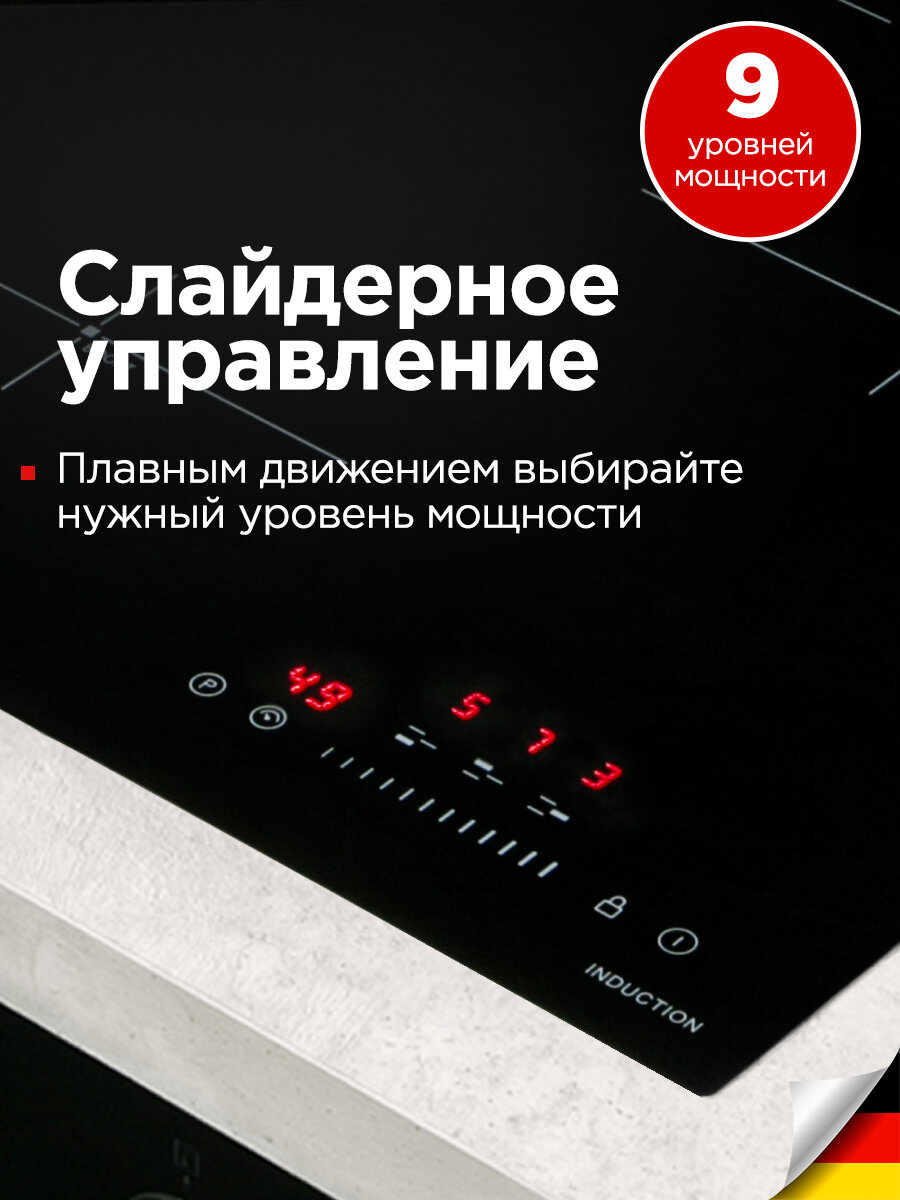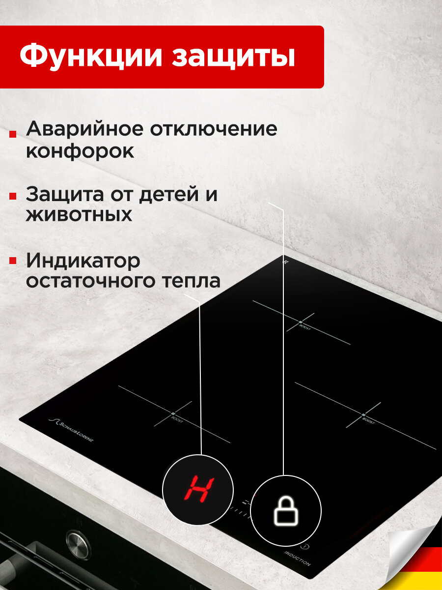 защитное отключение конфорок, индикатор остаточного тепла, кнопка блокировки панели, Автоотключение