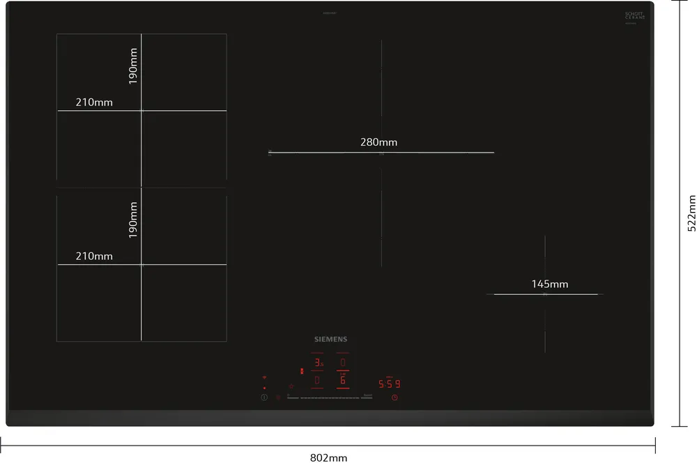 защитное отключение конфорок, индикатор остаточного тепла, кнопка блокировки панели