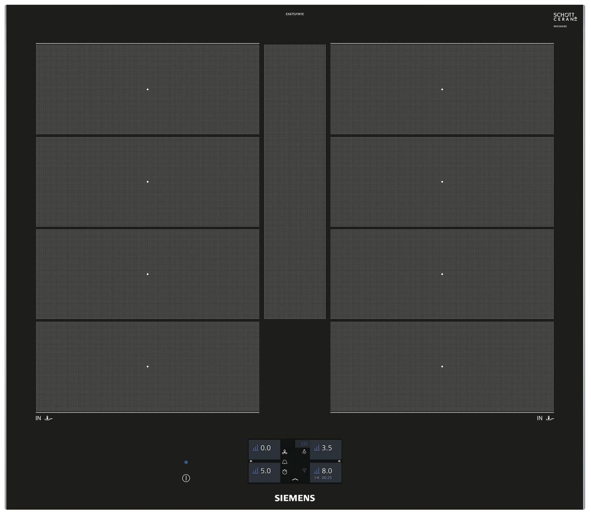 индикация выбранной мощности, распознавание наличия посуды, дисплей для каждой зоны нагрева, управление с мобильного устройства, Cleaning-пауза до 30 секунд, возможность объединения 2 зон нагрева, звуковой сигнал, функция "Power management"