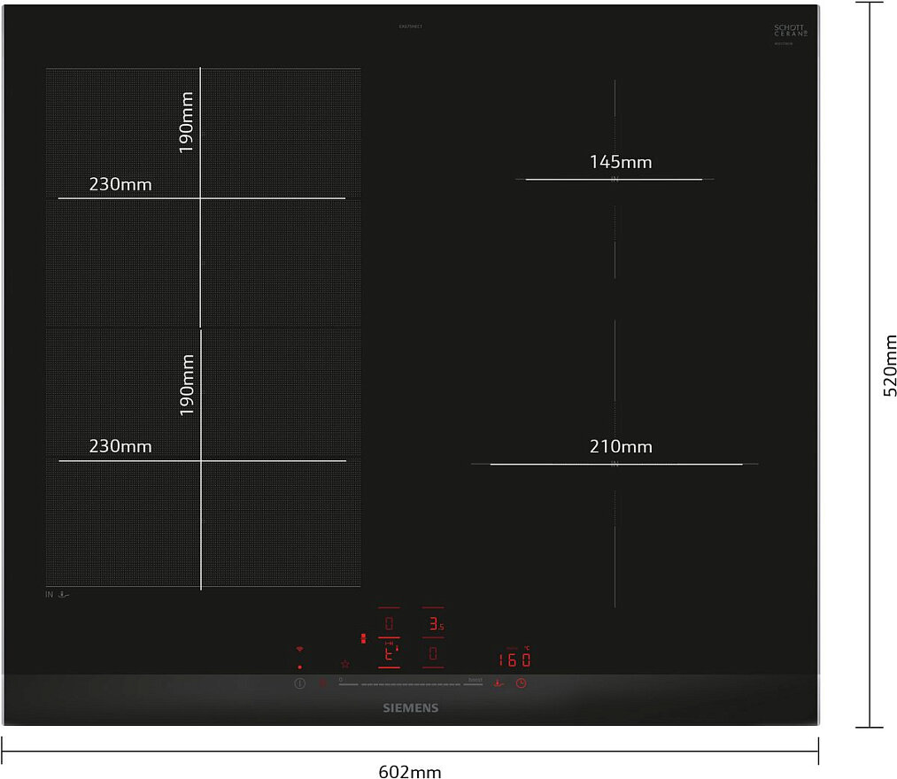 Передняя левая зона приготовления: 190 мм, 230 мм; Задняя левая зона приготовления: 230 мм, 190 мм; Задняя правая зона приготовления: 145 мм; Передняя правая зона приготовления: 210 мм