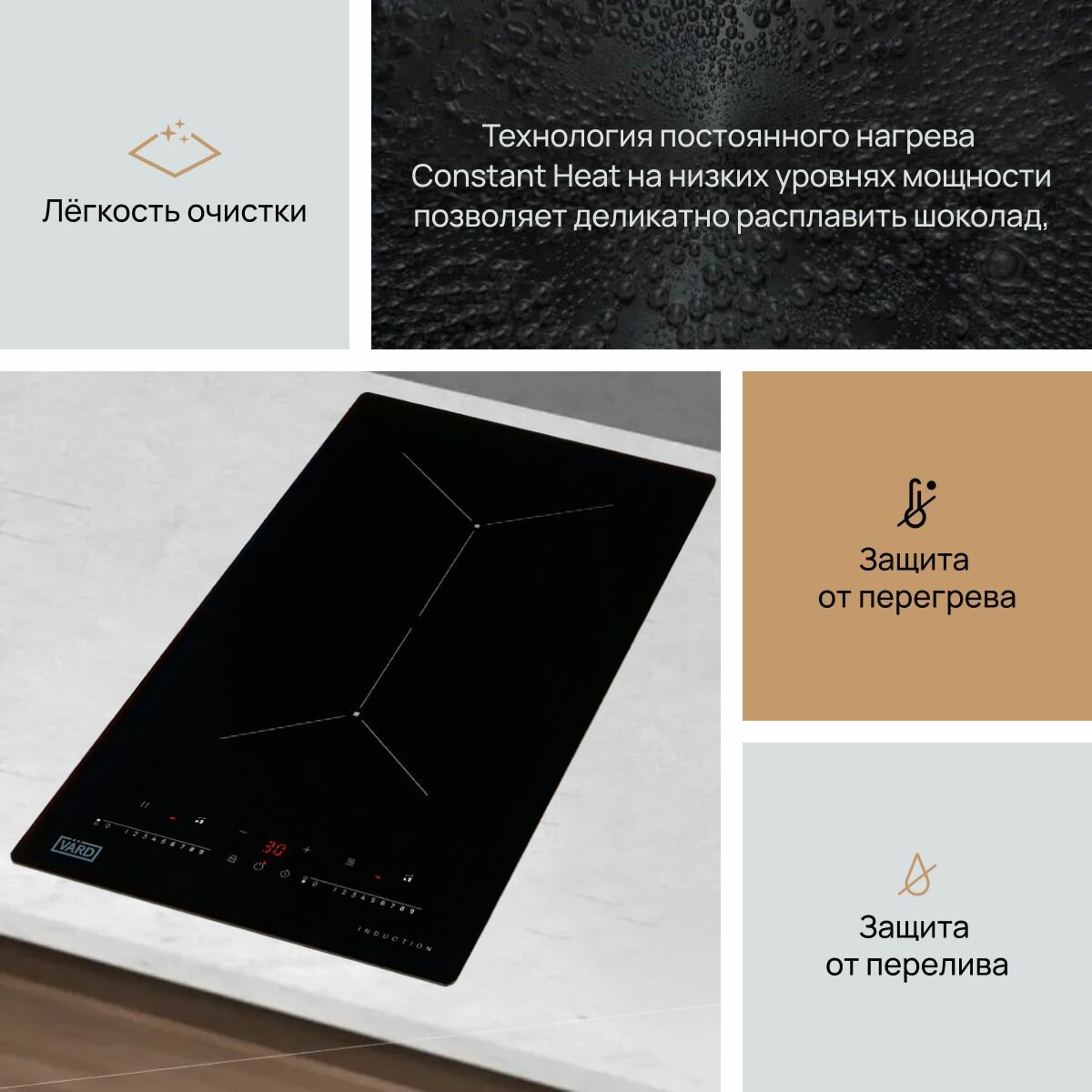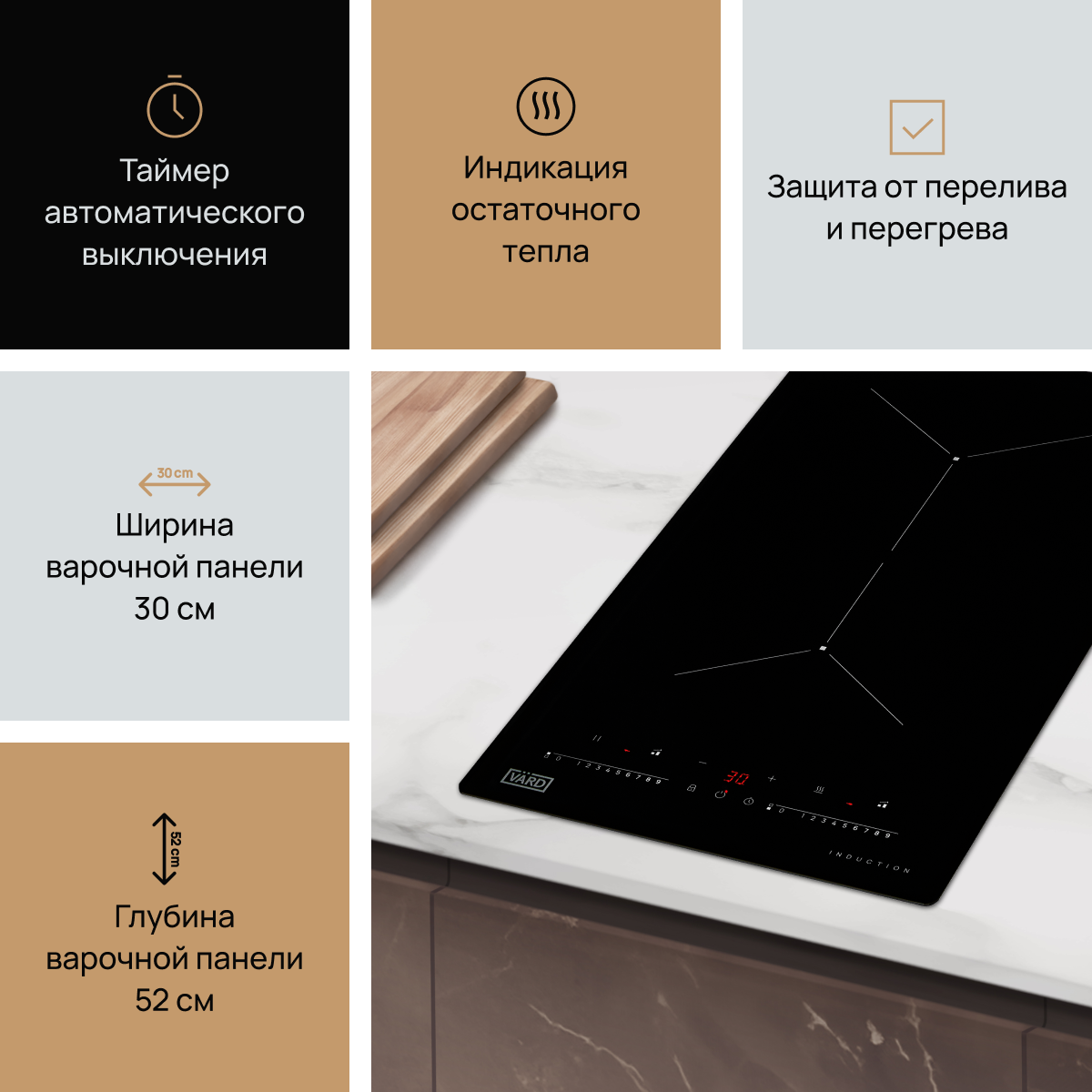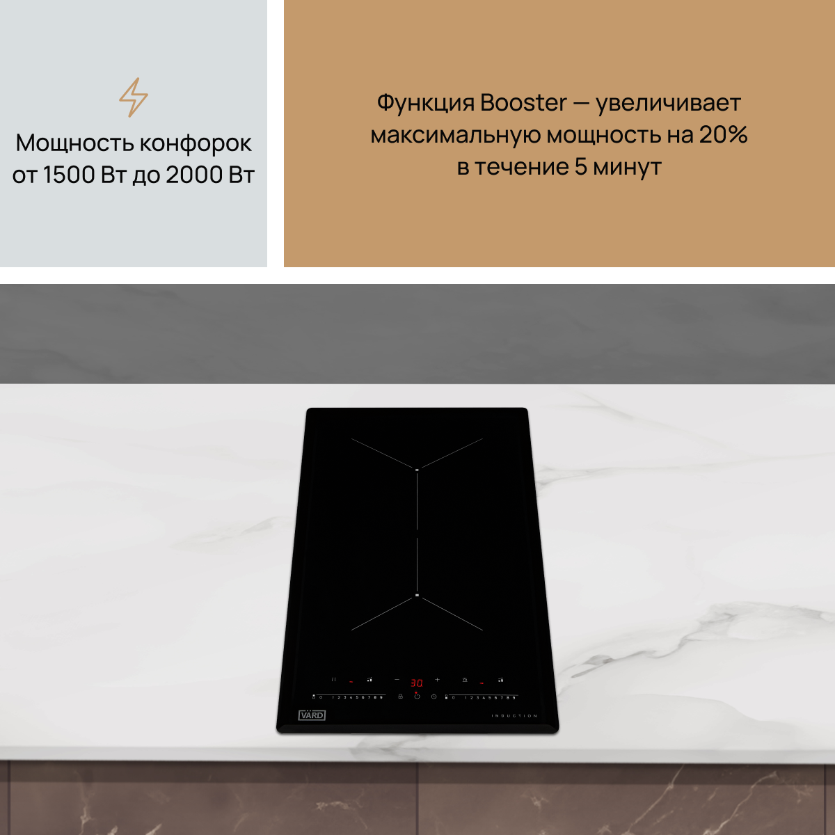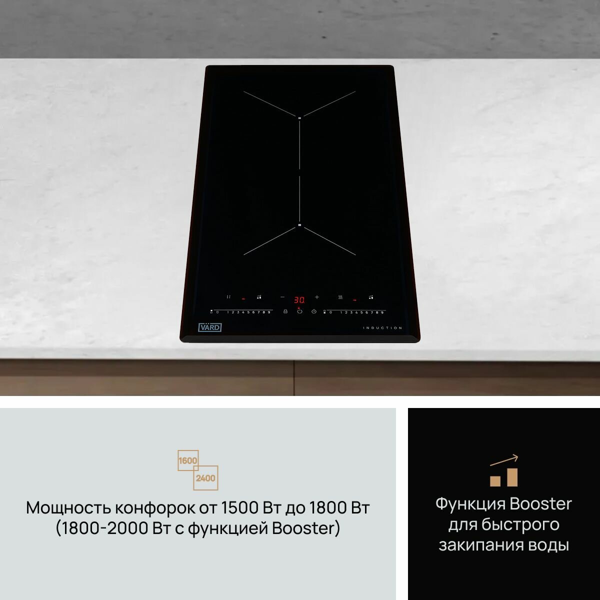 распознавание наличия посуды, распознавание размера посуды, таймер, функция Booster, Быстрый нагрев