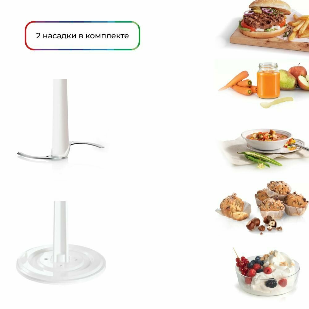 венчик для взбивания, универсальный нож, 2, Насадка-блендер, Нож для взбивания, Нож-измельчитель, Чаша-измельчитель, насадка для взбивания, нет, общее число насадок: 2, эмульсионная насадка
