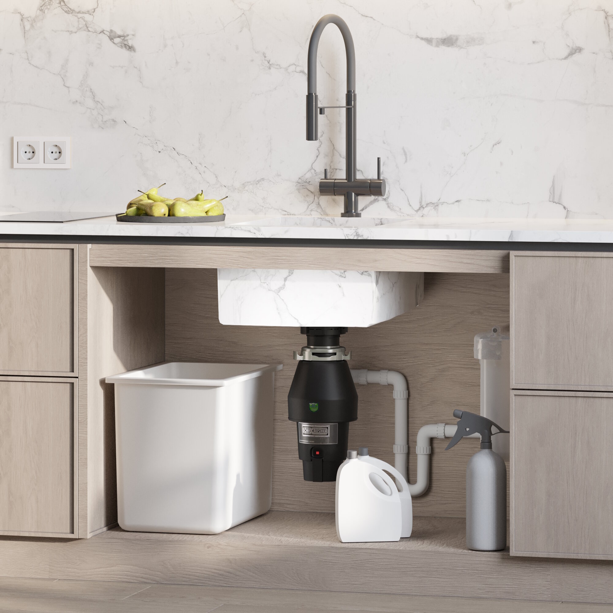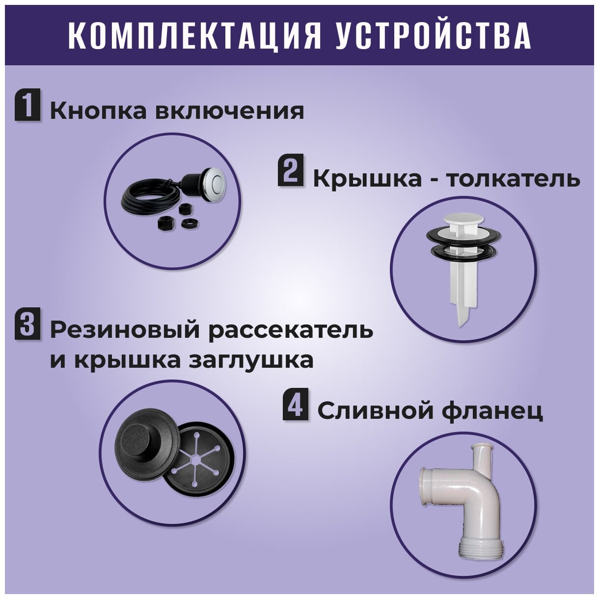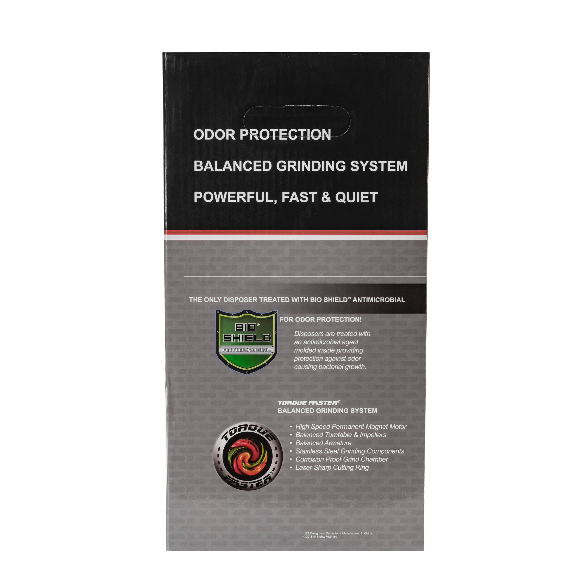 технологии Bio Shield, Torque Master, Master Mounting System; электрический провод 90 см Литые ударные кулаки. Перерабатывает волокнистые пищевые отходы, бананы, луковую шелуху, стручки фасоли и гороха, очистки от креветок. Корпус выполнен из прочного поликарбоната 940 с добавлением частиц серебра, для предотвращения появления микробов и бактерий. Отсутствие вибрации достигается за счет компьютерной балансировки всех подвижных частей прибора. Устанавливается на любой тип моек. Запатентованные технологии концерна Anaheim Marketing International: Bio Shield - добавление частиц серебра в материал корпуса для предотвращения образования микробов и бактерий Torque Master - компьютерная балансировка всех подвижных частей прибора Master Mounting System - винтовое крепление горловины Mr. Scrappy - многофункциональный инструмент, разработанный концерном AMI для безопасного проталкивания пищевых отходов в камеру прибора, пробка для набора воды в раковину, блокировка для попадания посторонних предметов в камеру прибора. Имеет 2 уровня фиксации. Запрещено утилизировать пластик, влажные салфетки, нитки, веревки, панцири крупных мидий и устриц.