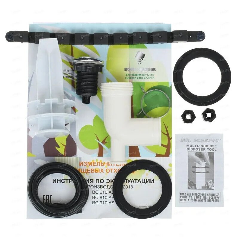 Mr. Scrappy - многофункциональный инструмент, разработанный концерном AMI для безопасного проталкивания пищевых отходов в камеру прибора, пробка для набора воды в раковину, блокировка для попадания посторонних предметов в камеру прибора. Имеет 2 уровня фиксации.