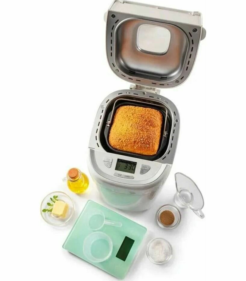 Отложенный старт; Поддержание температуры после выпекания; Функции мультиповара: настройка программ; Индикация включениявремени приготовленияэтапы программы; Дисплей; Прорезиненные ножки; Окно контроля процесса; Съемная форма; Звуковой сигнал; Сохранение программы при сбое электропитания; Не русифицированное экранное меню; Программы хлебопечения: безглютеновый хлеб/бородинский хлеб/ржаной хлеб/безглютеновый кекс/багет; Программы приготовления: бездрожжевая выпечка/варенье/каша/кекс/подогрев/творог/тесто/мармелад/питьевой йогурт; Дополнительно в комплекте: книга рецептов, мерный стакан, мерная ложка