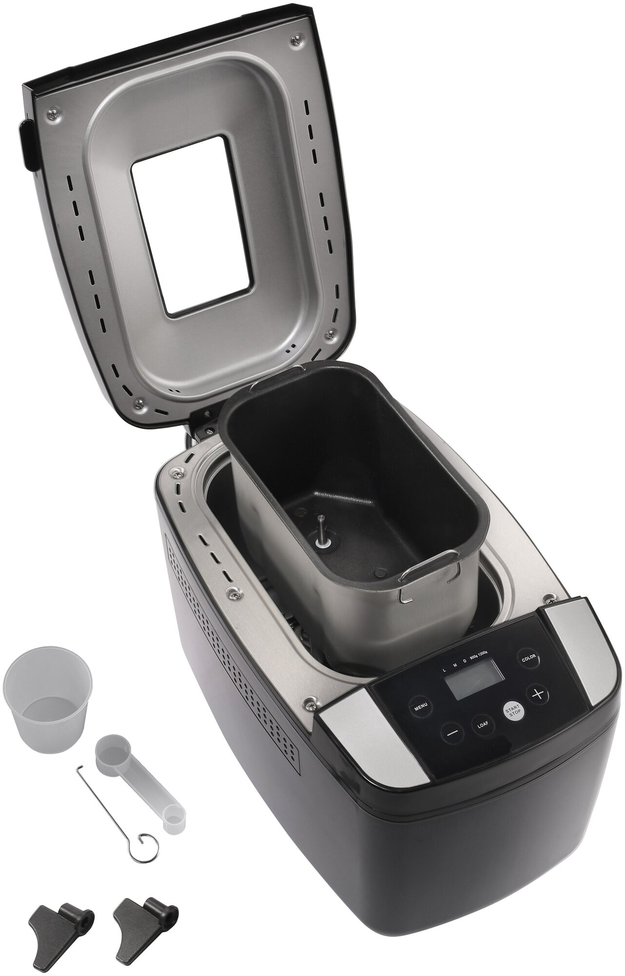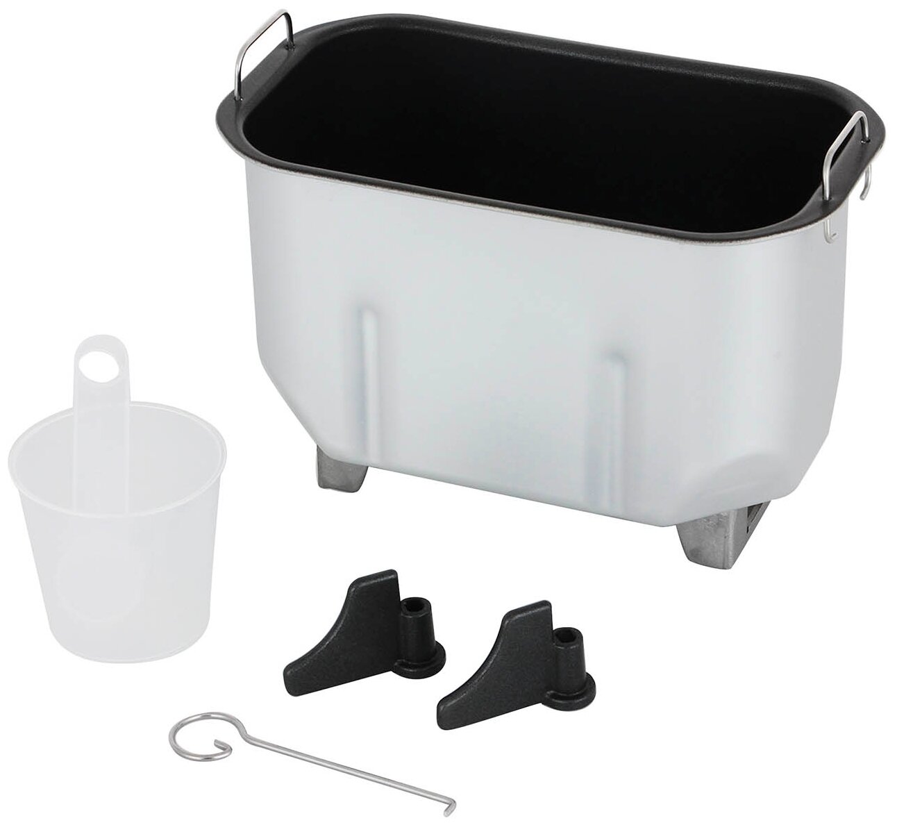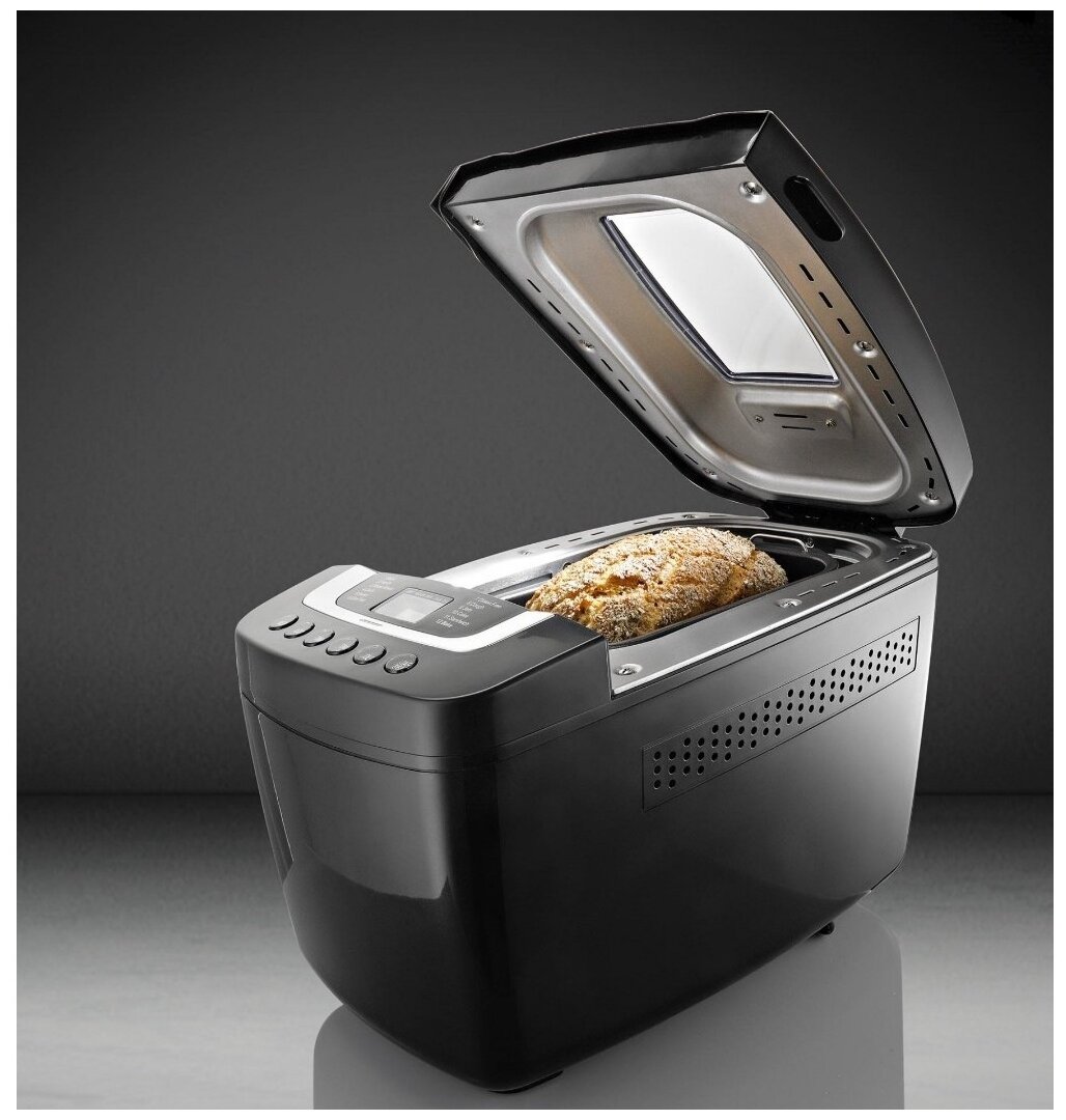 Поддержание температуры после выпекания; Индикация включениявремени приготовления; Дисплей; Прорезиненные ножки; Окно контроля процесса; Звуковой сигнал; Сохранение программы при сбое электропитания; Отсек для сетевого шнура; Программы хлебопечения: безглютеновый хлеб/бородинский хлеб/ржаной хлеб/багет; Программы приготовления: варенье/кекс/подогрев/тесто; Дополнительно в комплекте: книга рецептов, мерный стакан, мерная ложка
