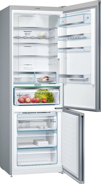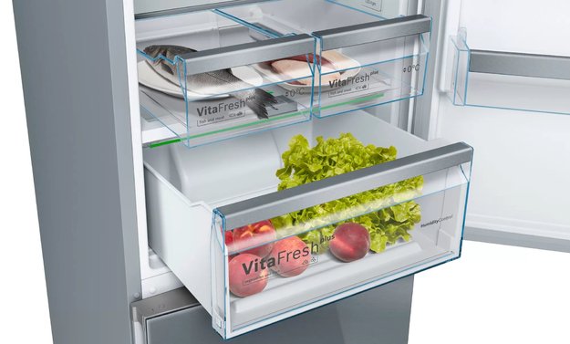Потребляемая мощность (Вт): 100, Зона свежести VitaFresh Plus 25 л, Зона "Chiller" с пониженной температурой, 4 выдвижные стеклянные полки, Функция Eco mode, FM SM, Manual/automatic activiation, Цвет корпуса: Нержавеющая сталь с покрытием EasyClean