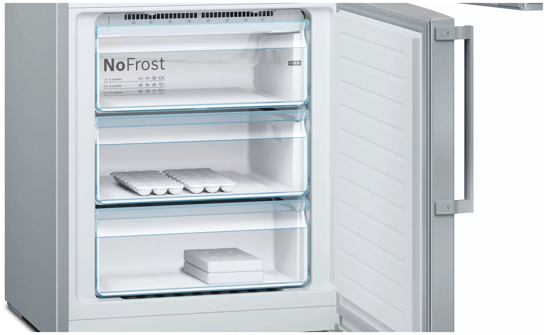 4 дверные полки; в комплекте; подставка для бутылок, форма для льда, подставка для яиц; регулировка по высоте: ножки спереди, ролики сзади; аккумулятор холода в комплекте