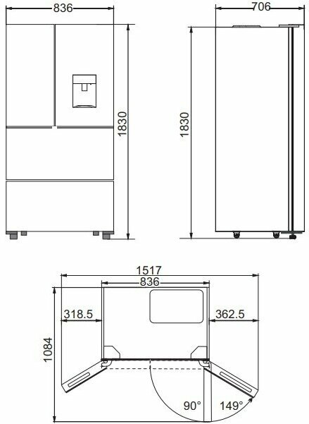 French Door, Side by Side, дисплей, В стороны, Влево, Вправо, Выдвижное, ЖК дисплей, Светодиодная подсветка, Скрытые ручки
