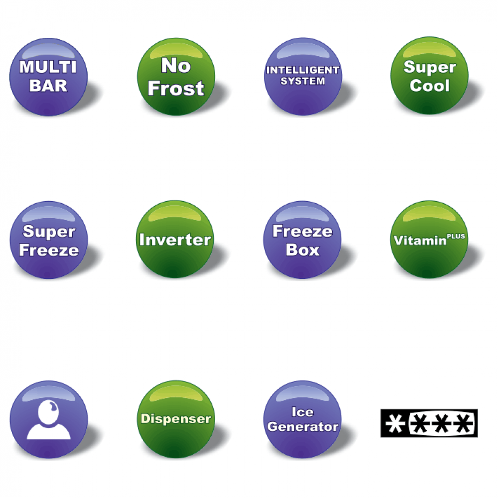 «отпуск», суперзаморозка, суперохлаждение, Авторазморозка, Генератор льда, Диспенсер, Ионизатор, Система контроля влажности