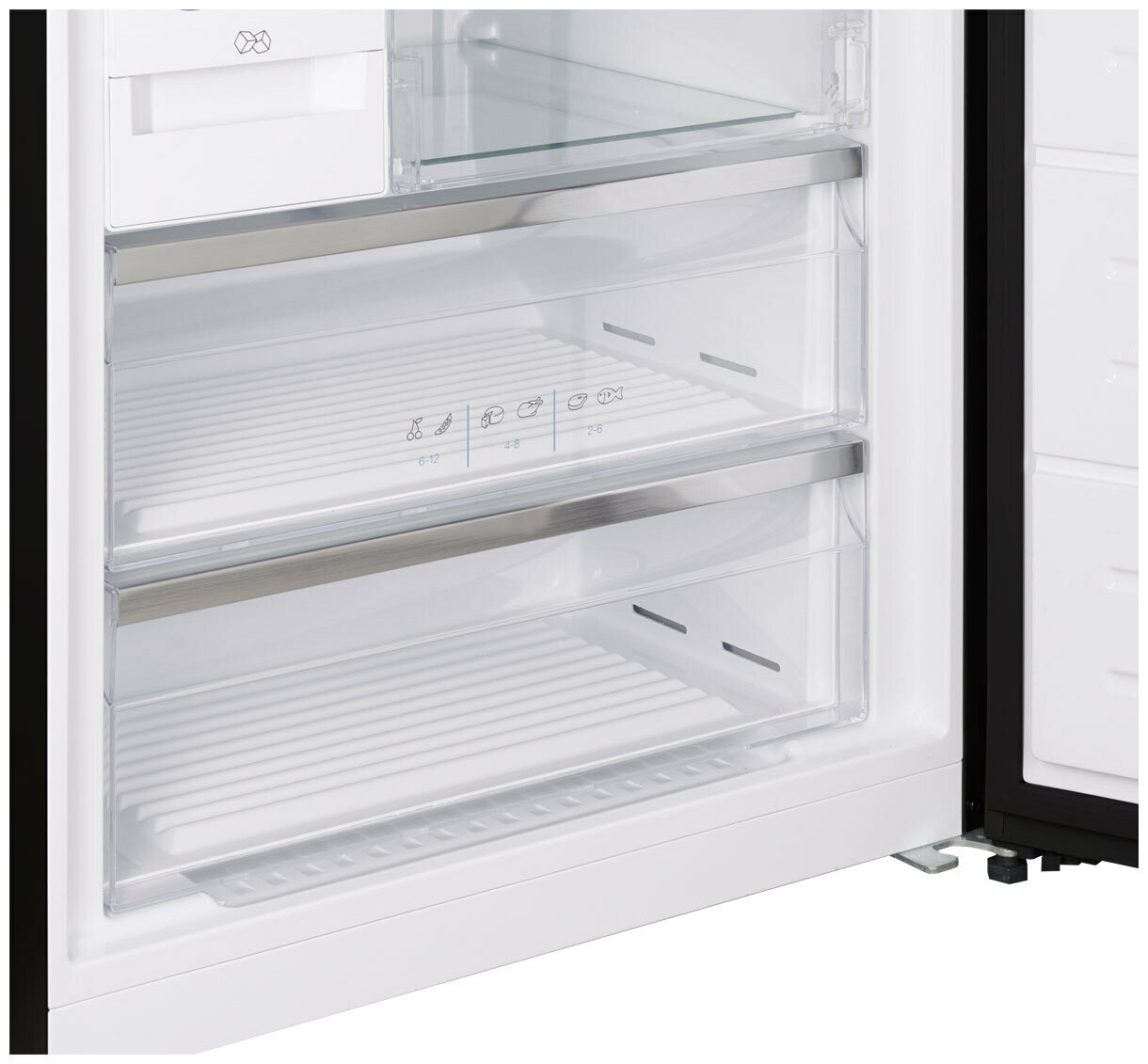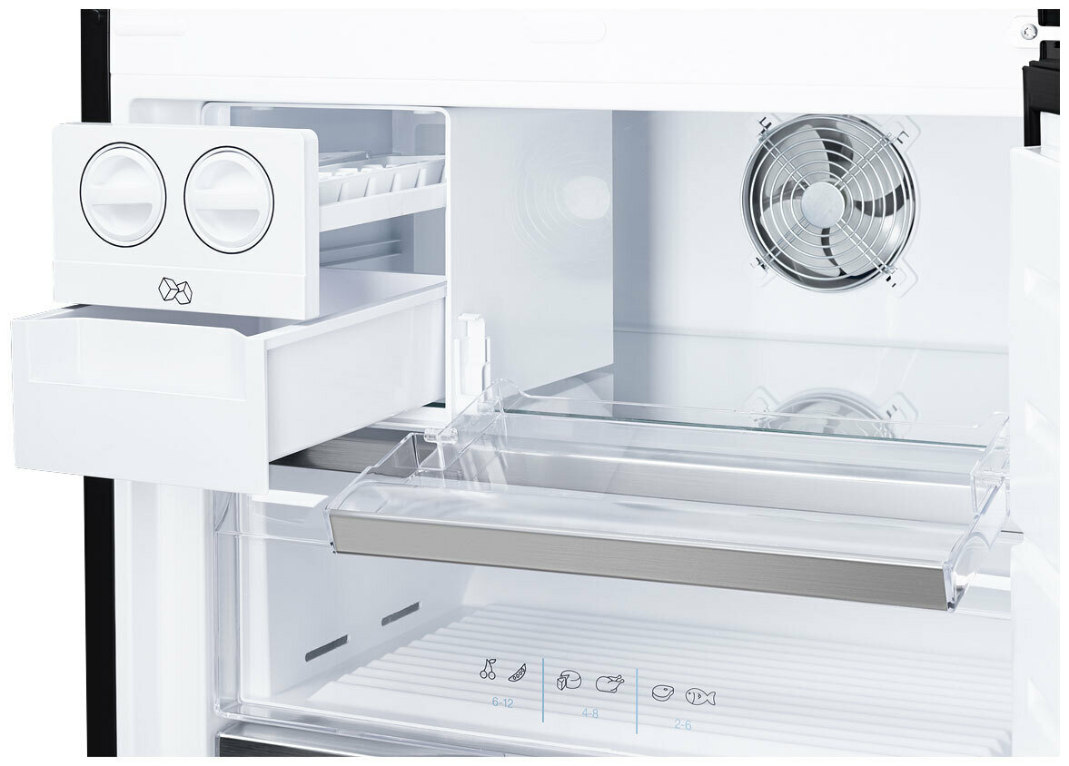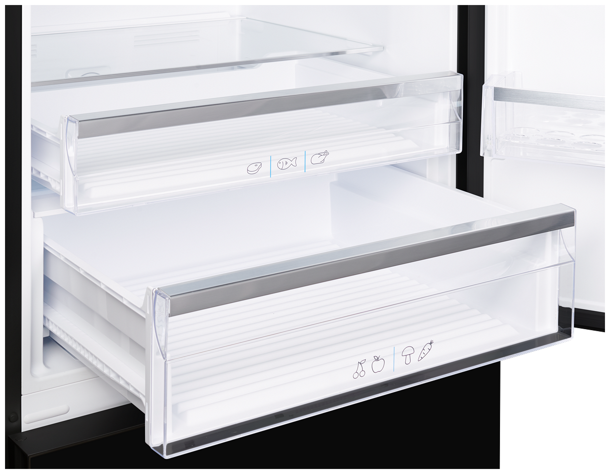 LED дисплей, светодиодное освещение камеры, антибактериальный пластик, держатель бутылок, навесные дверные полки: 4; отсек для овощей:1; полка для яиц, полки для заморозки: 1; емкость для льда: 1 шт; ледогенератор: да. механический