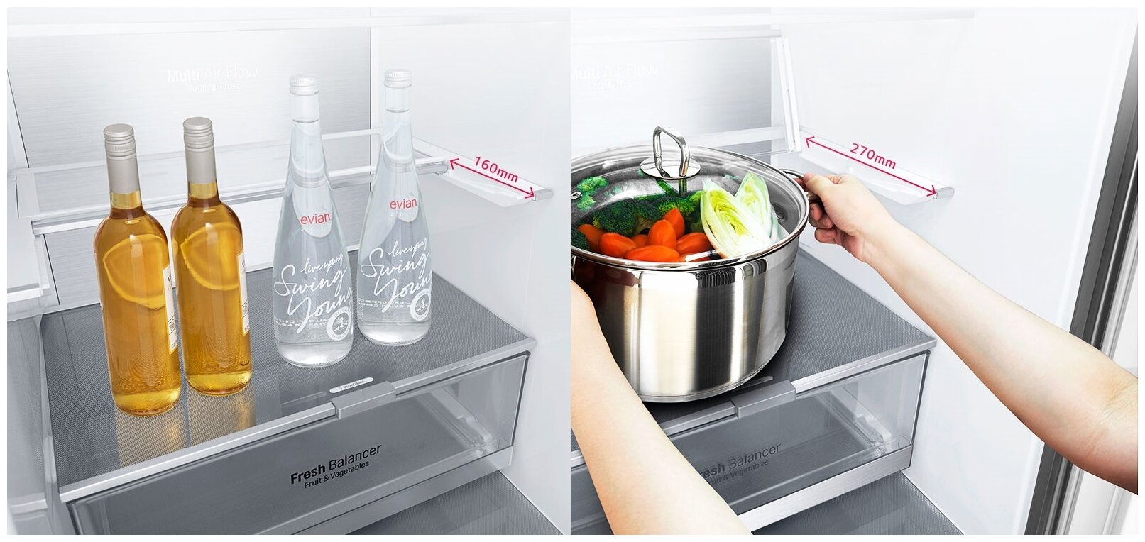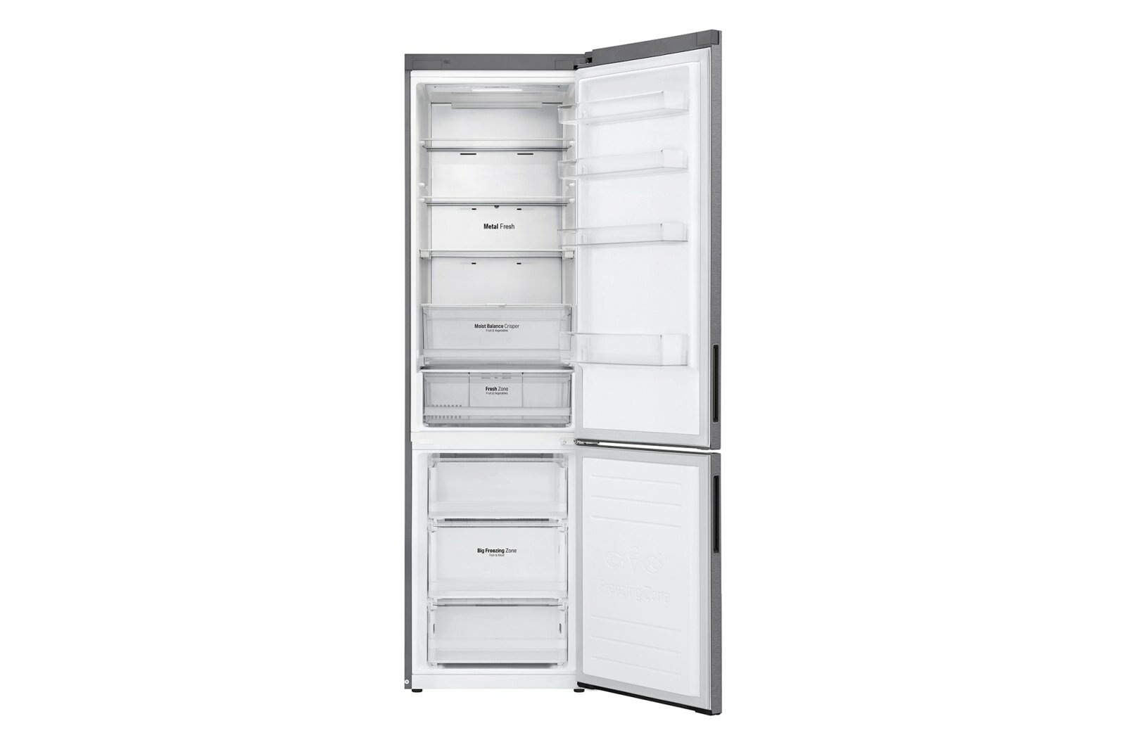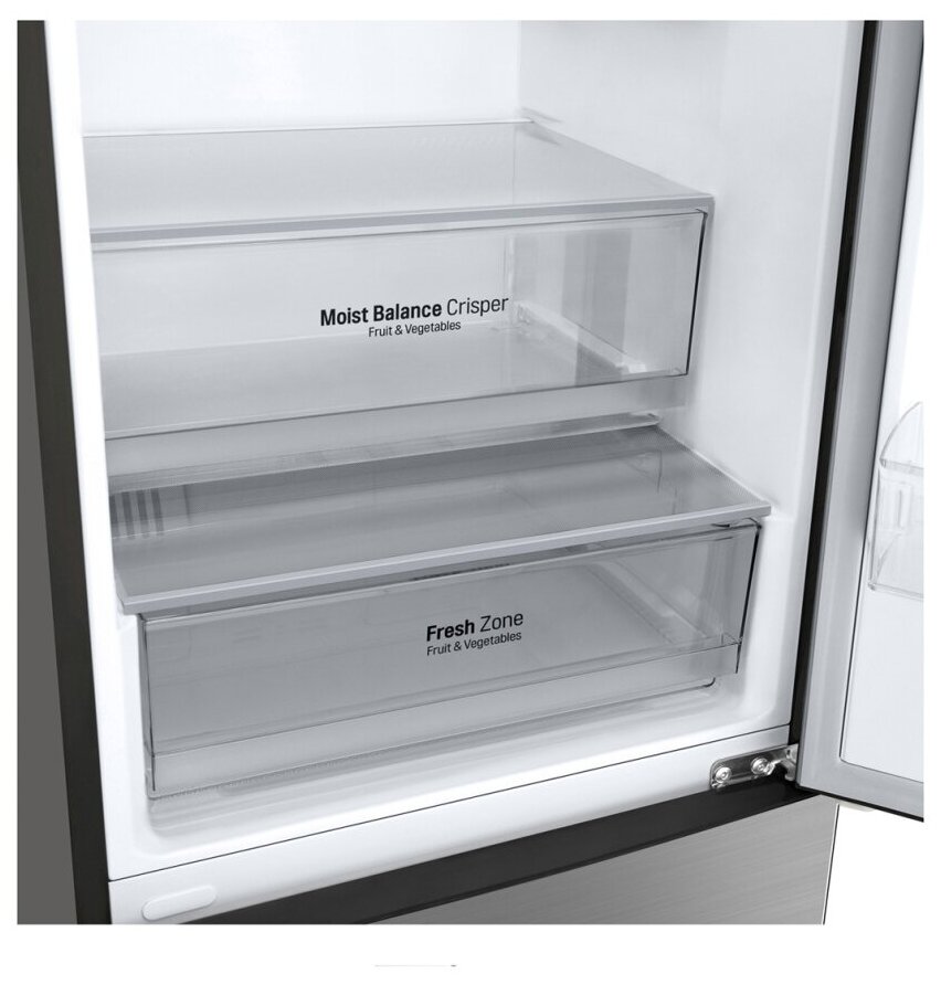 нулевой зазор, металлическая задняя стенка Metal Fresh; холодильная камера: крышка Moist Balance Crisper, лоток для яиц (1 × 10 яиц), 4 дверные корзины с металлической окантовкой