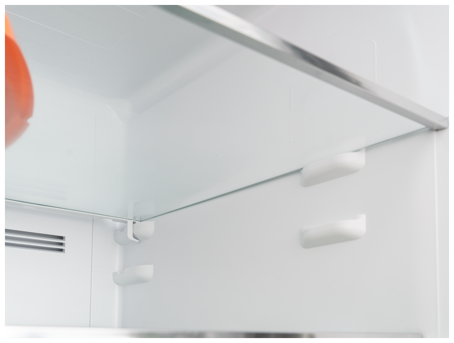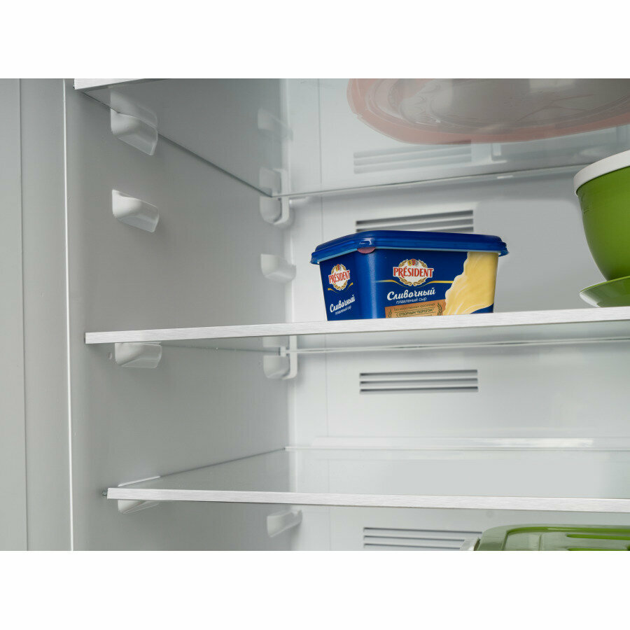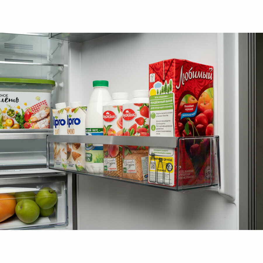 режим экономии энергии ECO, 4 полки на двери, хромированная окантовка полок, ящик для овощей и фруктов, лоток для льда, лоток для яиц, угол открытия дверей холодильника 90°, внутреннее освещение LED