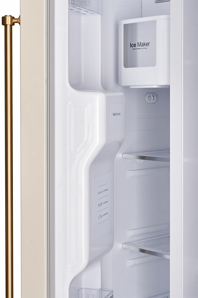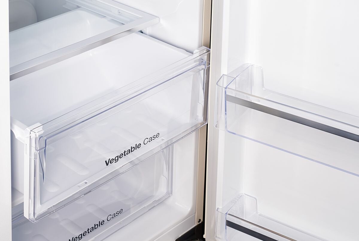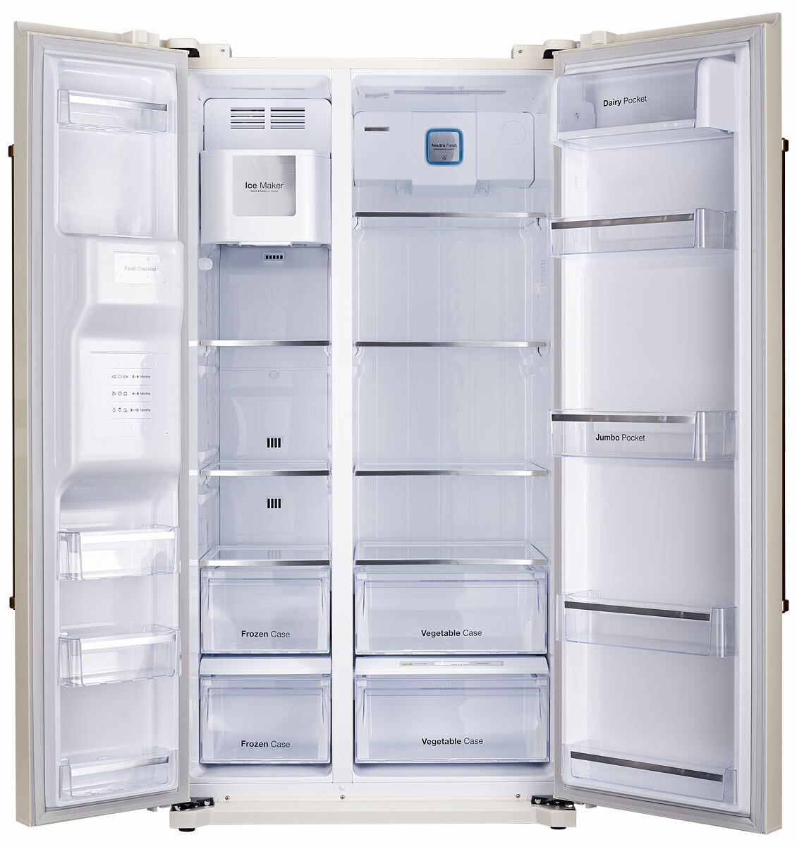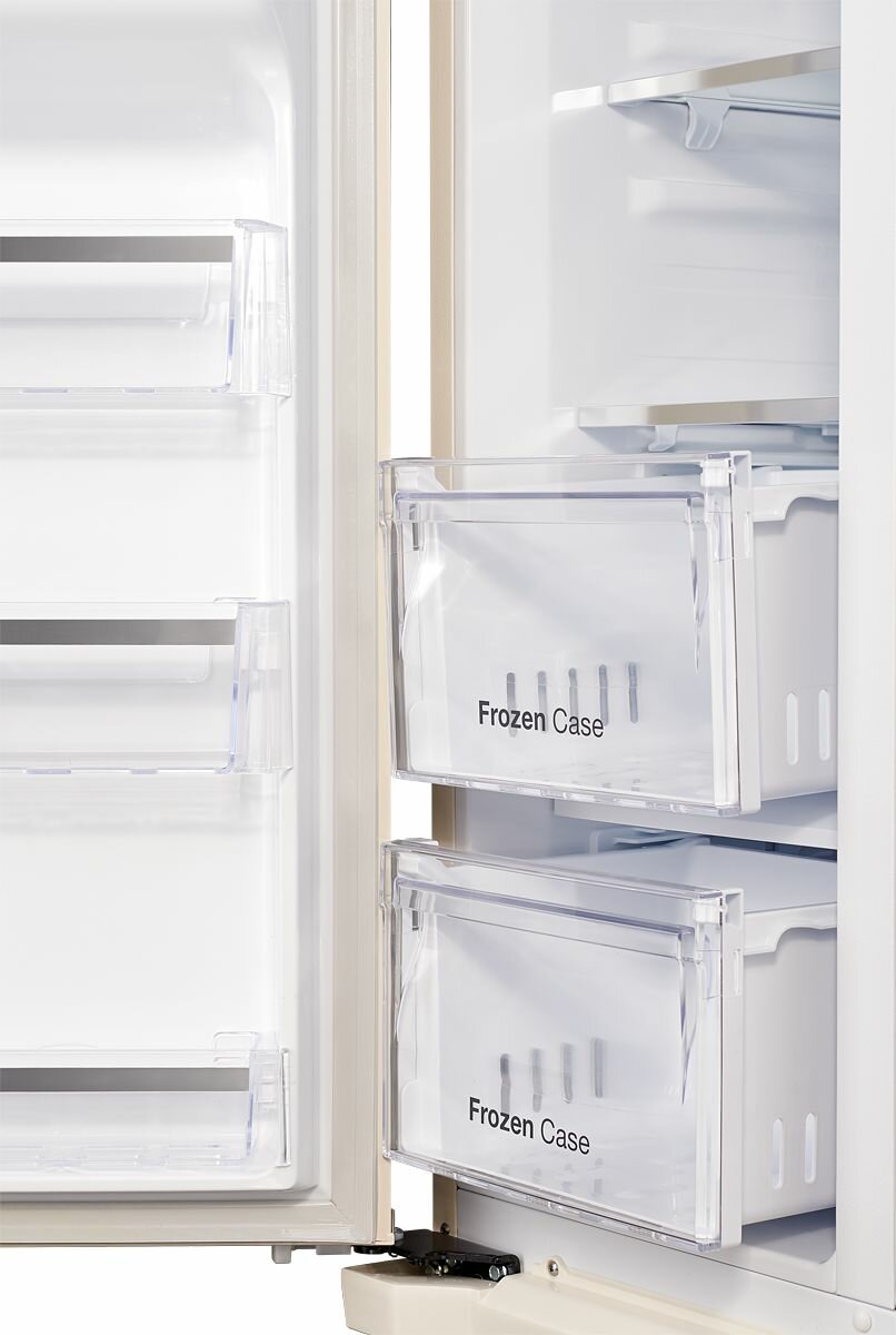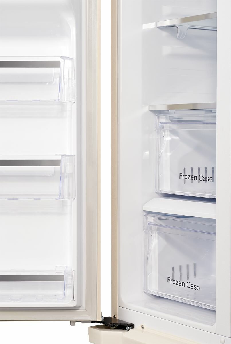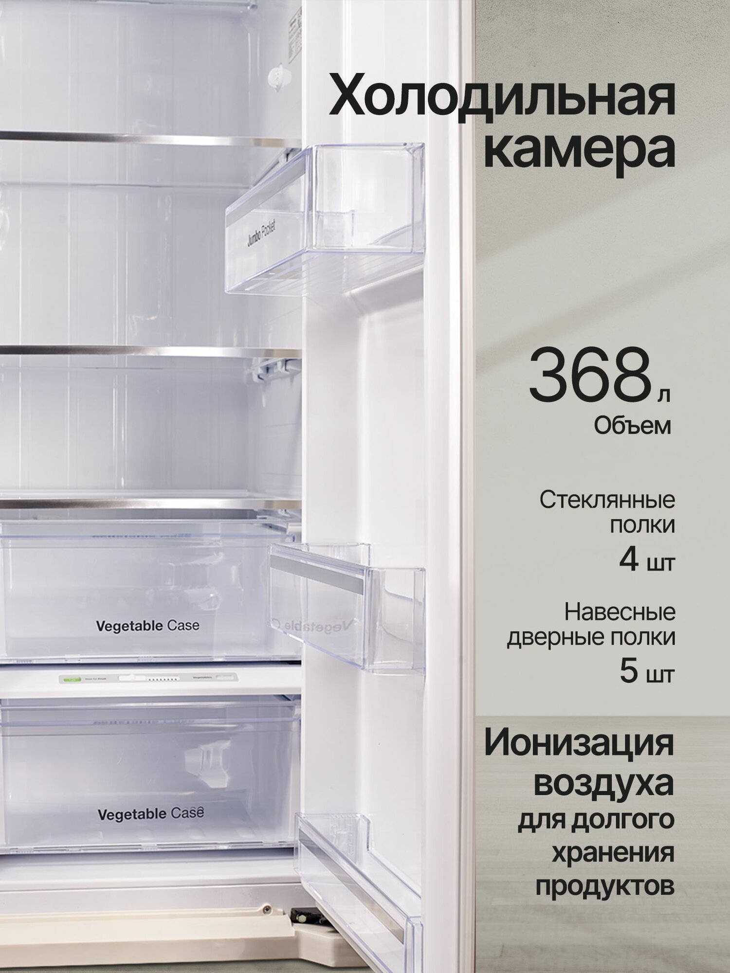 светодиодное освещение камеры; количество дверных полок в морозильном отделении - 4; ледогенератор - кубики, дробленный лёд, охлажденная вода; в холодильном отделении 3 полки регулируются по высоте, 5 навесных дверных полок, 2 отсека для овощей, зона свежести, полка для яиц; возможность блокировки дверцы