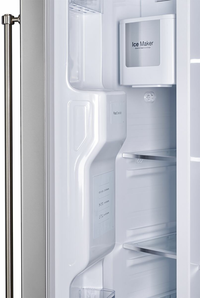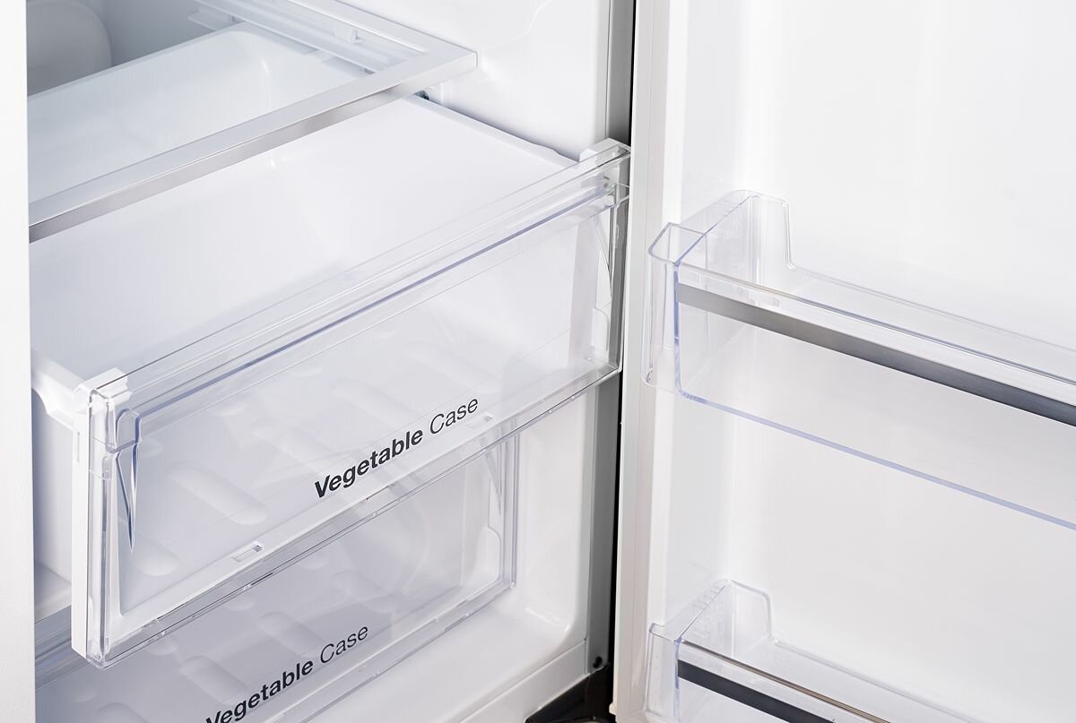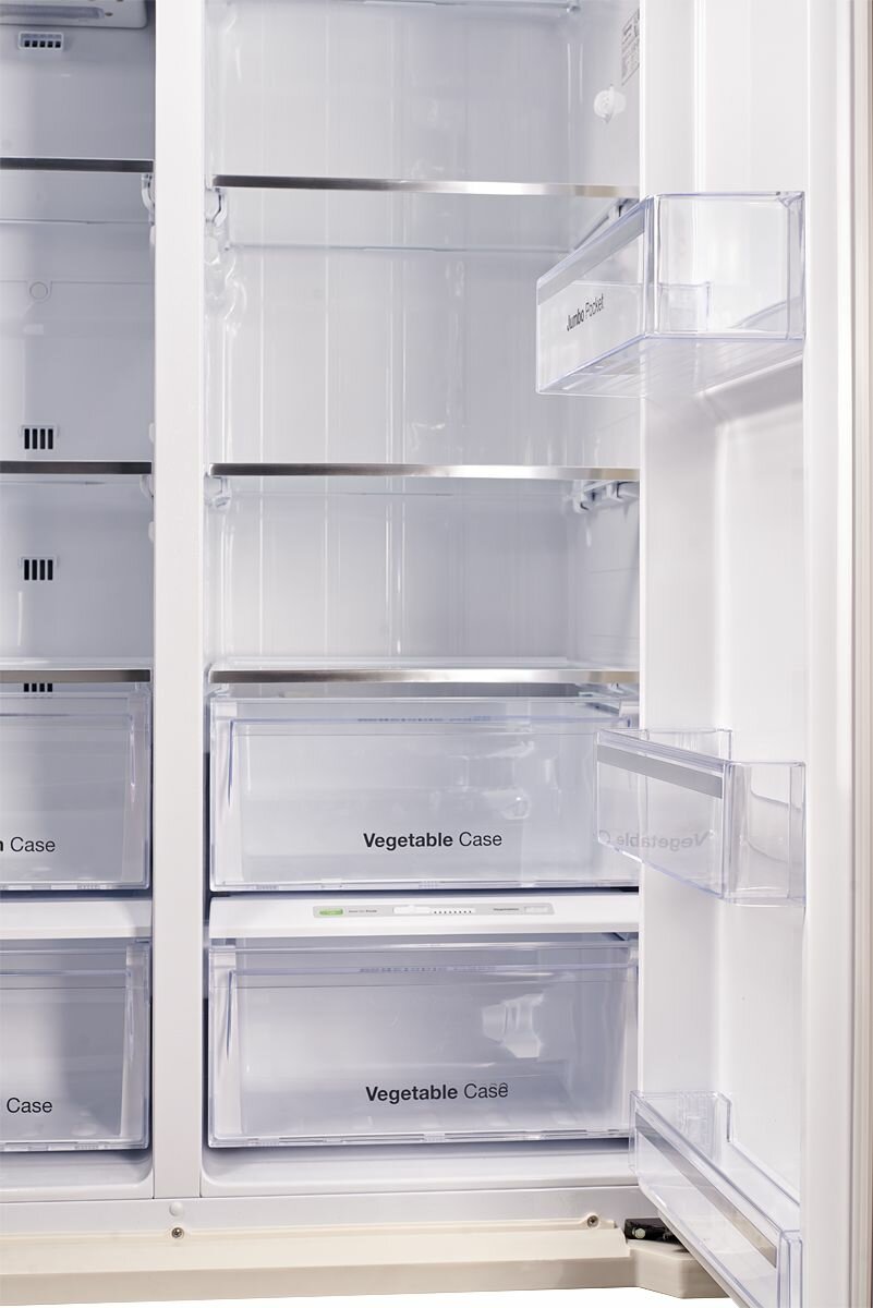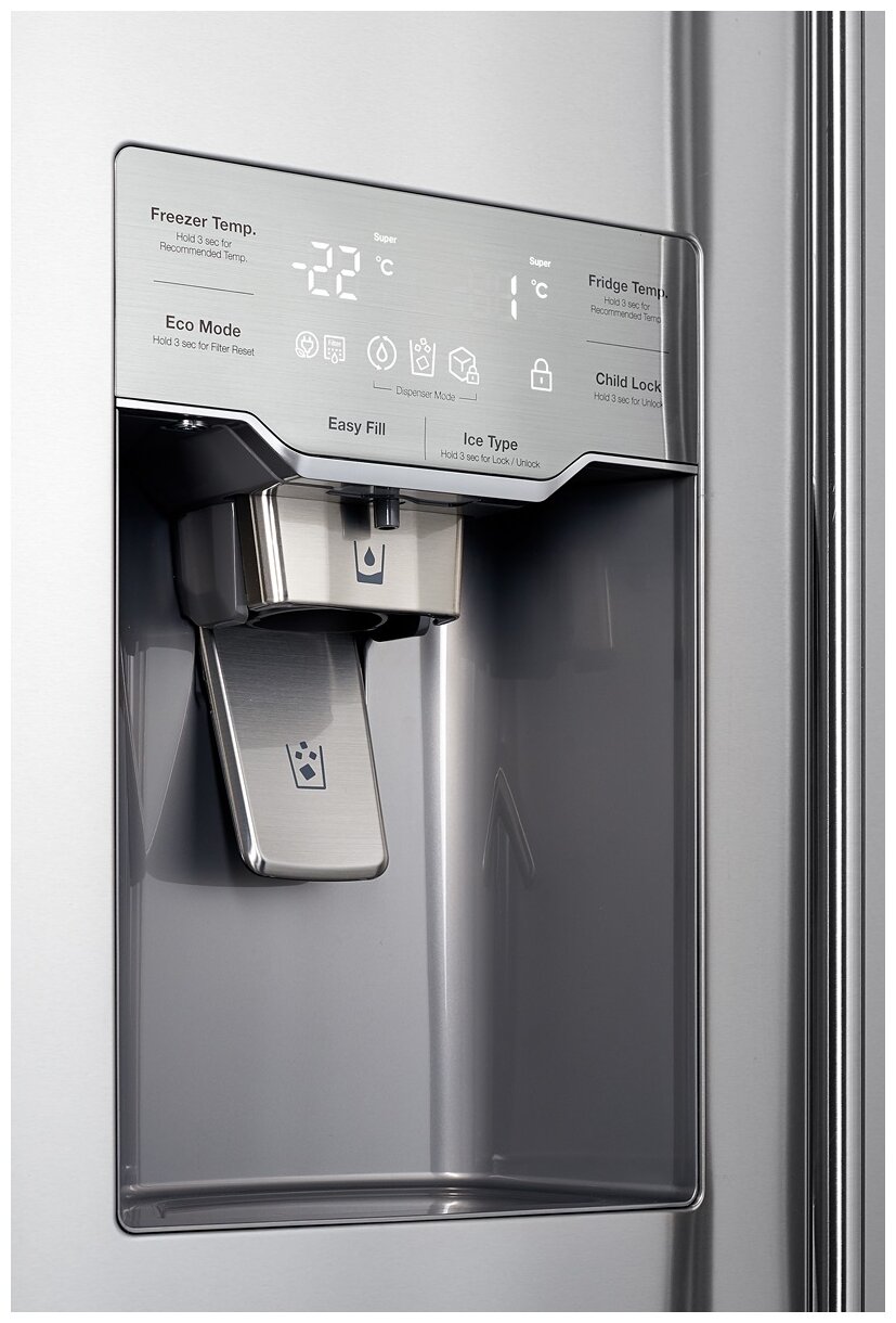 светодиодное освещение камеры; количество дверных полок в морозильном отделении - 4; ледогенератор - кубики, дробленный лёд, охлажденная вода; в холодильном отделении 3 полки регулируются по высоте, 5 навесных дверных полок, 2 отсека для овощей, зона свежести, полка для яиц; возможность блокировки дверцы