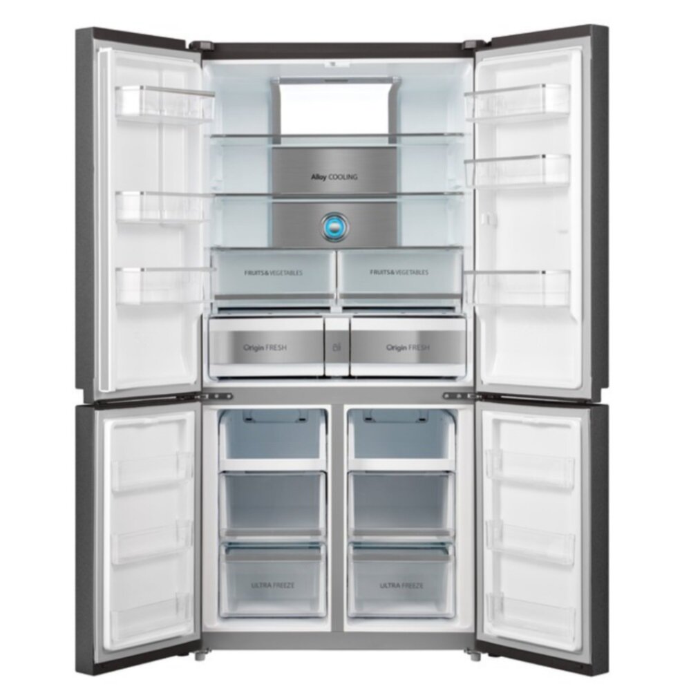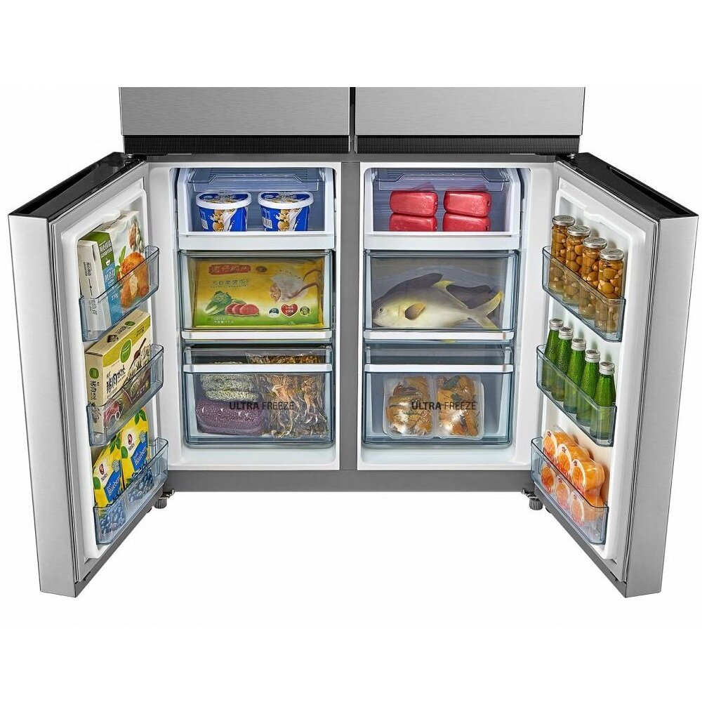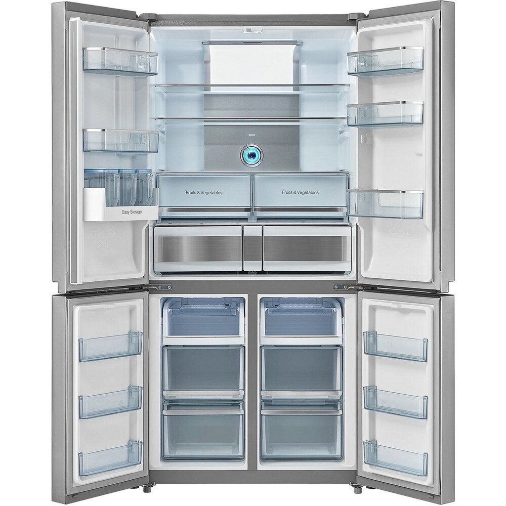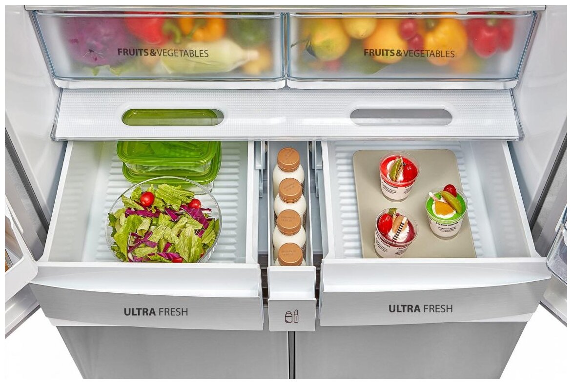 Его полезный объём составляет целых 622 литра. Всё, что нужно, уместится в трёх камерах: двух отдельных холодильных и одной вместительной морозильной. Открывая одну из четырёх дверей, вы получаете доступ к нужному отсеку.