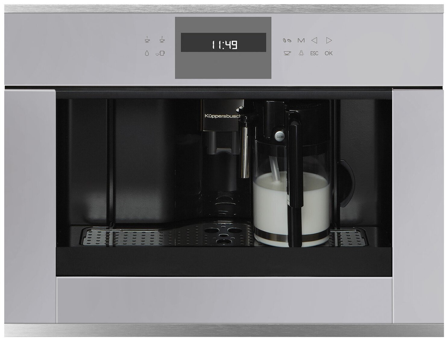 Размеры прибора (Ш x В x Г): ≈ 595 x 455 x 475 мм (вкл. фасад 20 мм и телескопические направляющие) Тип установки: Встраиваемый Возможность выбора крепости кофе (5 предварительно заданных уровней) Емкость для воды заполняется спереди Количество программ: 5 Программируемое время включения 3 температуры кофе на выбор Съемный контейнер для молока с функцией очистки Функция подачи молока для приготовления капучино или латте Электронный таймер с белыми индикаторами Цвет отделки: нержавеющая сталь