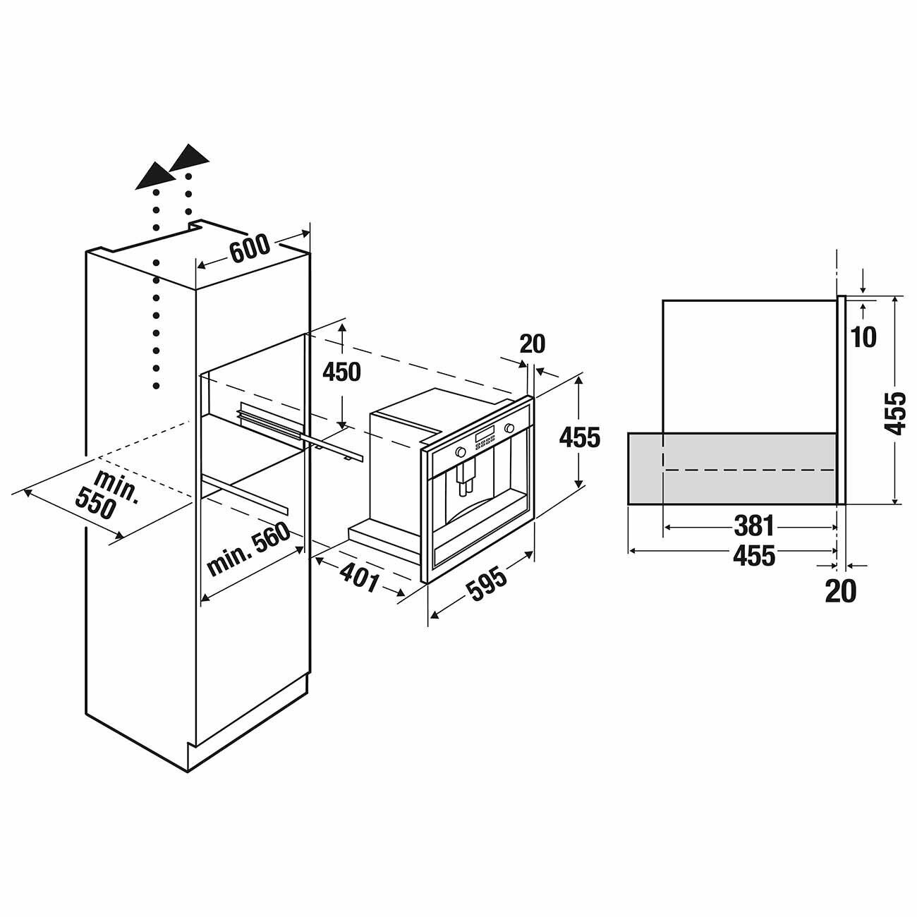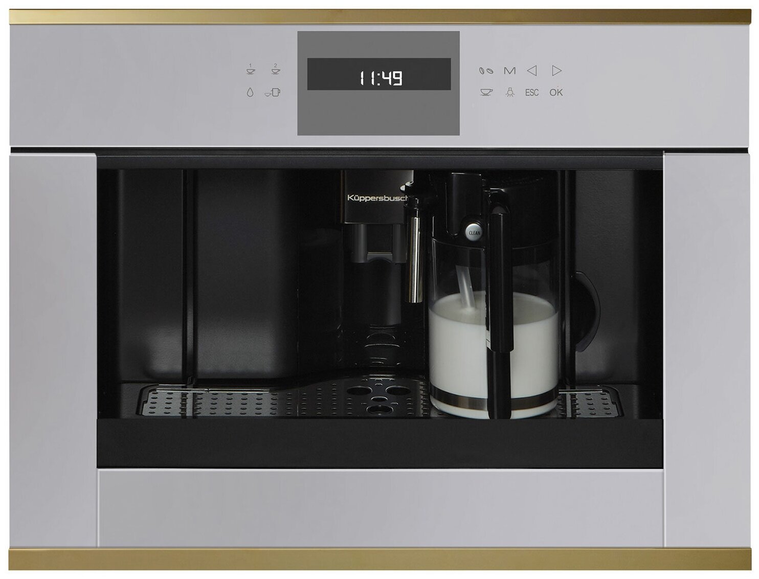 Размеры прибора (Ш x В x Г): ≈ 595 x 455 x 475 мм (вкл. фасад 20 мм и телескопические направляющие) Тип установки: Встраиваемый Возможность выбора крепости кофе (5 предварительно заданных уровней) Емкость для воды заполняется спереди Количество программ: 5 Программируемое время включения 3 температуры кофе на выбор Съемный контейнер для молока с функцией очистки Функция подачи молока для приготовления капучино или латте Электронный таймер с белыми индикаторами Цвет отделки: золотой