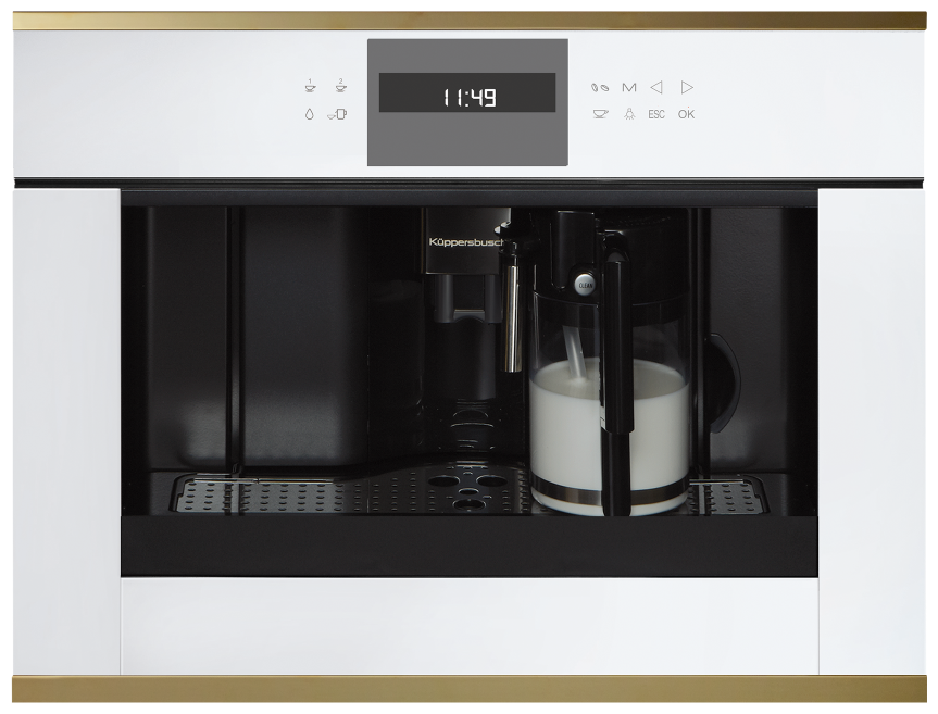 Размеры прибора (Ш x В x Г): ≈ 595 x 455 x 475 мм (вкл. фасад 20 мм и телескопические направляющие) Тип установки: Встраиваемый Возможность выбора крепости кофе (5 предварительно заданных уровней) Емкость для воды заполняется спереди Количество программ: 5 Программируемое время включения 3 температуры кофе на выбор Съемный контейнер для молока с функцией очистки Функция подачи молока для приготовления капучино или латте Электронный таймер с белыми индикаторами